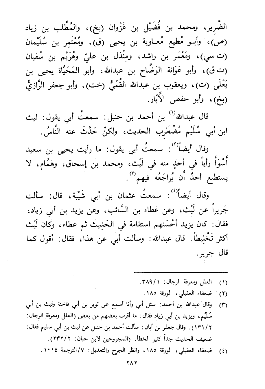 وَقَال أيضا (4) : سمعت عُثْمَان بْن أَبي شَيْبَة، قال: سألت جريرا عَنْ لَيْث، وعن عَطَاء بْن السَّائِب، وعن يَزِيد بْن أَبي زِيَاد، فَقَالَ: كَانَ يَزِيد أحسنهم استقامة في الحديث ثم عطاء، وكان لَيْث أكثر تخليطا. قال عَبد اللَّهِ: وسَأَلتُ أَبِي عَنْ هَذَا، فَقَالَ: أقول كما قال جرير.
