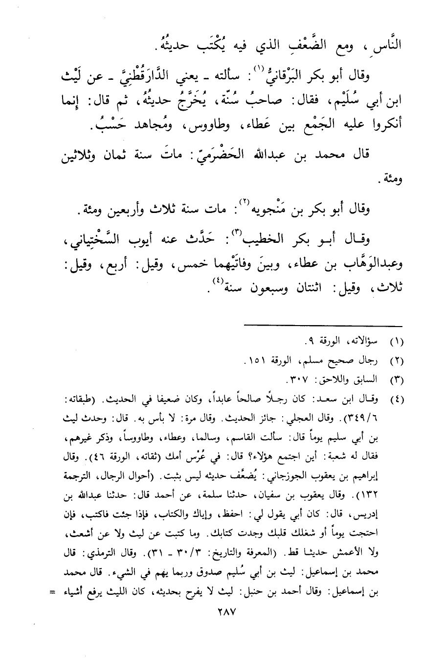 وَقَال أَبُو بكر البرقاني (1) : سألته، يَعْنِي الدارقطني، عَن ليث ابن أَبي سُلَيْم، فَقَالَ: صاحب سنة، يخرج حديثه، ثُمَّ قال: إِنَّمَا أنكروا عليه الجميع بين عطاء وطاووس، ومجاهد حسب.