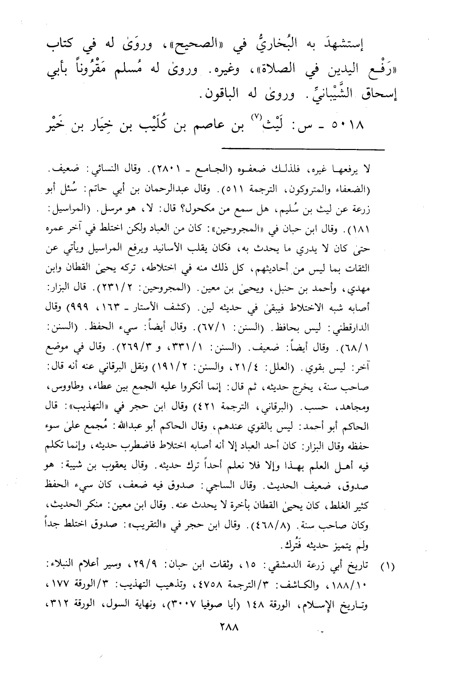 (1) تاريخ أبي زرعة الدمشقي: 15، وثقات ابن حبان: 9 / 29، وسير أعلام النبلاء: 10 / 188، والكاشف: 3 / الترجمة 4758، وتذهيب التهذيب: 3 / الورقة 177، وتاريخ الاسلام، الورقة 148 (أيا صوفيا 3007) ، ونهاية السول، الورقة 312،