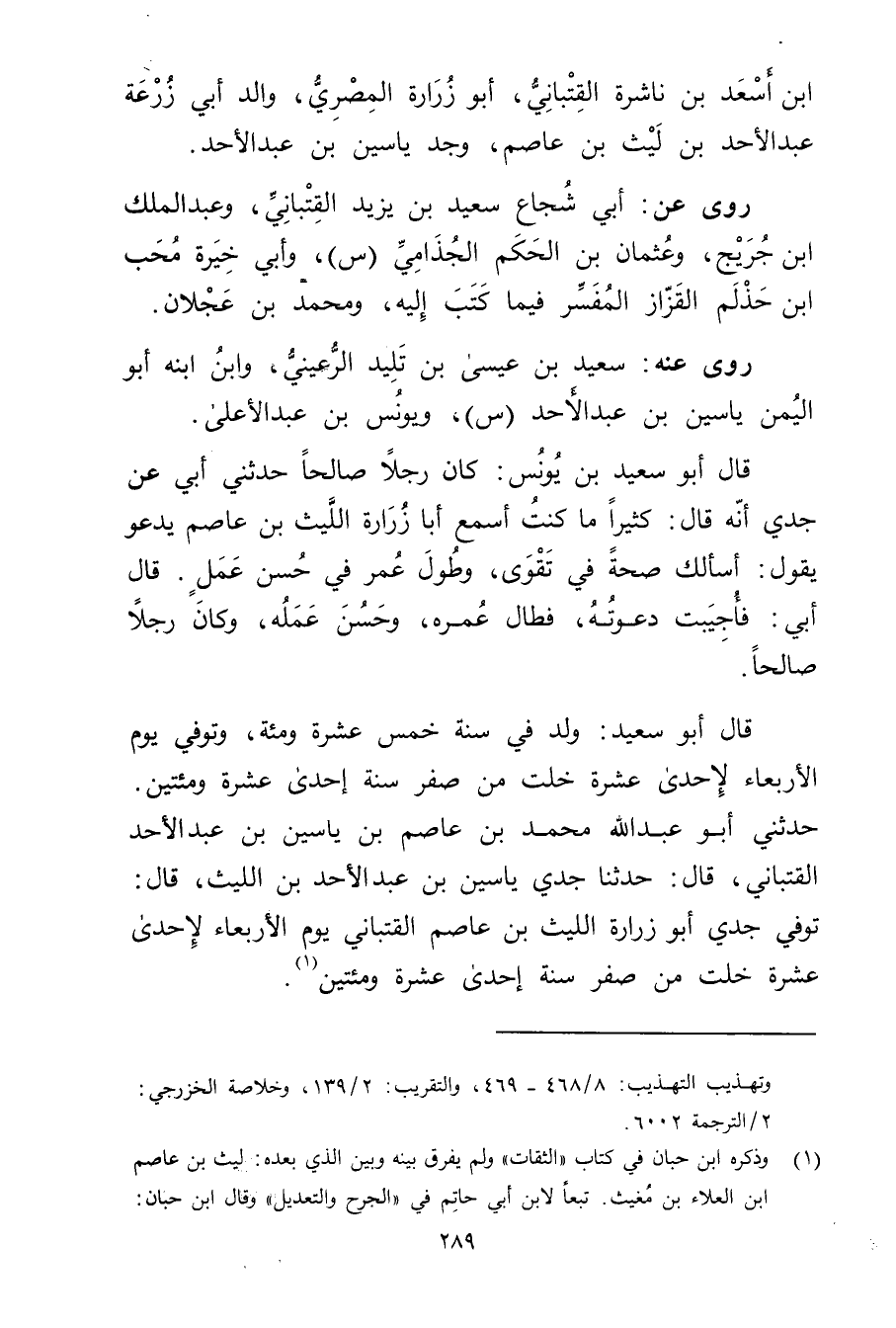 (1) وذكره ابنُ حِبَّان في كتاب "الثقات" ولم يفرق بينه وبين الذي بعده: ليث بن عاصم ابن العلاء بن مغيث. تبعا لابن أَبي حاتم في "الجرح والتعديل "وَقَال ابن حبان: