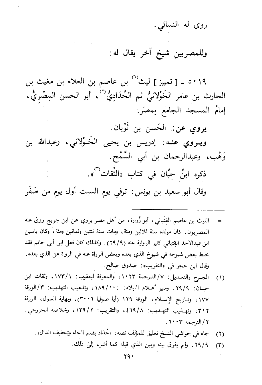 5019 - تمييز لَيْث بن عَاصِم بن الْعَلاء بن مغيث بن الْحَارِث بن عَامِر الخولاني (1) ثم الحدادي (2) ، أَبُو الْحَسَن المِصْرِي، إمام المسجد الجامع بمصر.