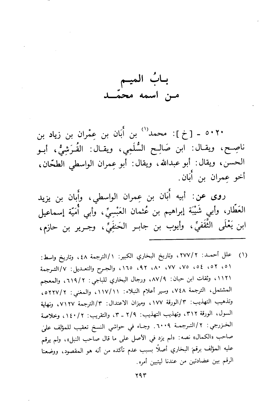 5020 -[خ] : مُحَمَّد بن أبان بن عِمْران بن زياد بن ناصح (1) ، ويُقال: ابْن صالح السلمي، ويُقال: القرشي، أبو الحسن، ويُقال: أبو عَبد الله، ويُقال: أبوعِمْران الواسطي الطحان، أخو عِمْران بْن أبان.