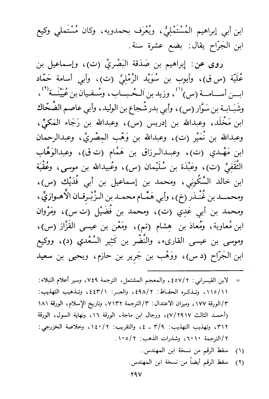 = لابن القيسراني: 2 / 457، والمعجم المشتمل، الترجمة 49، وسير أعلام النبلاء: 11 / 115، وتذكره الحفاظ: 2 / 498، والعبر: 1 / 443، وتذهيب التهذيب: 3 / الورقة 177، وميزان الاعتدال: 3 / الترجمة 7132، وتاريخ الاسلام، الورقة 181 (أحمد الثالث 2917 / 7) ، ورجال ابن ماجة، الورقة 16، ونهاية السول، الورقة 312، وتهذيب التهذيب: 9 / 3 - 4، والتقريب: 2 / 140، وخلاصة الخزرجي: 2 / الترجمة 6010، وشذرات الذهب: 2 / 105.
