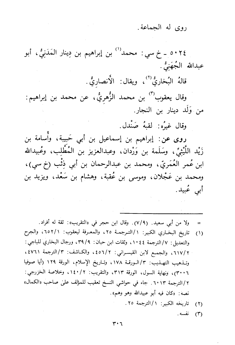 (1) تاريخ البخاري الكبير: 1 / الترجمة 25، والمعرفة ليعقوب: 1 / 652، والجرح والتعديل: 7 / الترجمة 1044، وثقات ابن حبان: 9 / 39، ورجال البخاري للباجي: 2 / 617، والجمع لابن القيسراني: 2 / 456، والكاشف: 3 / الترجمة 4761، وتذهيب التهذيب: 3 / الورقة 178، وتاريخ الاسلام، الورقة 129 (أيا صوفيا 3006) ، ونهاية السول، الورقة 313، والتقريب: 2 / 140، وخلاصة الخزرجي: 2 / الترجمة 6013.