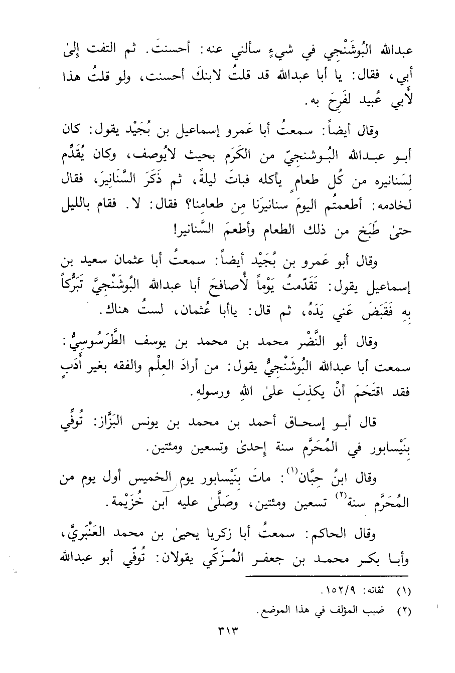 وَقَال أيضا: سمعت أَبَا عَمْرو إِسْمَاعِيل بْن بجيد يَقُول: كَانَ أَبُو عَبْد اللَّهِ البوشنجي من الكرم بحيث لا يوصف، وكان يقدم لسنانيره من كل طعام يأكله فبات ليلة، ثُمَّ ذكر السنانير، فَقَالَ لخادمه: أطعمتم اليوم سنانيرنا من طعامنا؟ فَقَالَ: لا. فقام بالليل حَتَّى طبخ من ذلك الطعام وأطعم السنانير!.