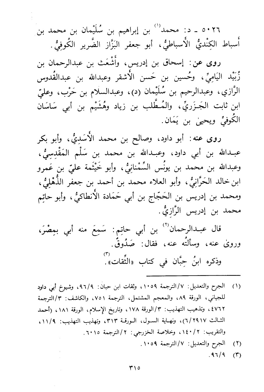 5026 - د: مُحَمَّد بن إِبْرَاهِيم بن سُلَيْمان بن مُحَمَّد بن أسباط الْكِنْدِيّ الأسباطي (1) ، أَبُو جَعْفَر البزاز الضرير الكوفي.