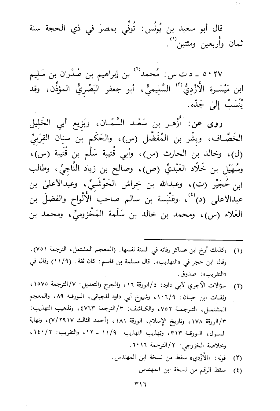 5027 - د ت س: مُحَمَّد بن إِبْرَاهِيم بن صدران بن سُلَيْم (2) ابن ميسرة الأَزْدِيّ (3) السليمي، أَبُو جَعْفَر البَصْرِيّ المؤذن، وقد ينسب إِلَى جده.