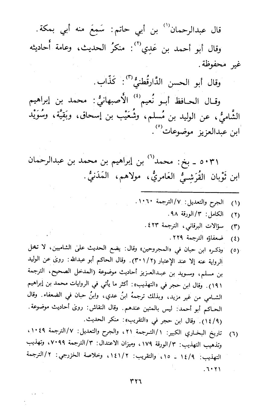 (5) وذكره ابنُ حِبَّان في "المجروحين "وَقَال: يضع الحديث على الشاميين، لا تحل الرواية عنه إلا عند الاعتبار (2 / 301) . وَقَال الحاكم أَبُو عَبْد اللَّهِ: روى عن الوليد بْن مسلم، وسويد بن عبد العزيز أحاديث موضوعة (المدخل الصحيح، الترجمة 191) . وَقَال ابن حجر في "التهذيب ": أكثر ما يأتي في الروايات محمد بن إبراهيم الشامي من غير مزيد، وبذلك ترجمة ابن عدي، وابن حبان في الضعفاء. وَقَال الحاكم أبو أحمد: ليس بالمتين عندهم. وَقَال النقاش: روى أحاديث موضوعة. (9 / 14) . وَقَال ابن حجر في "التقريب": منكر الحديث.