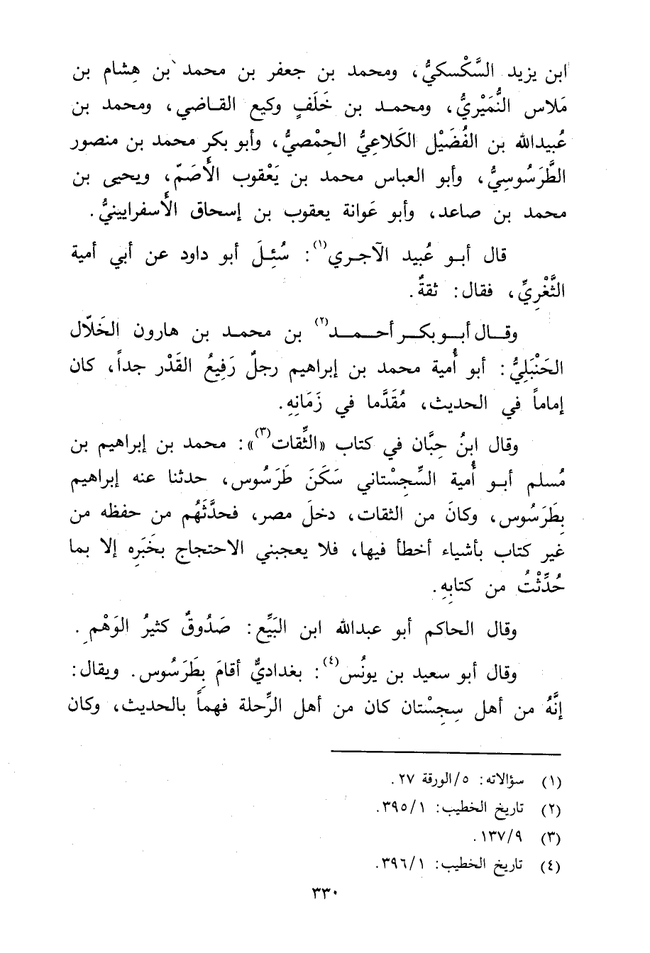 وَقَال ابْن حبان في كتاب "الثقات" (3) : مُحَمَّد بْن إِبْرَاهِيمَ بْن مسلم أَبُو أمية السجستاني سكن طرسوس، حَدَّثَنَا عنه إِبْرَاهِيم بطرسوس، وكان من الثقات، دخل مصر، فحدثهم من حفظه من غَيْر كتاب بأشياء أخطأ فِيهَا، فلا يعجبني الاحتجاج بخبره إِلا بما حدثت من كتابه.