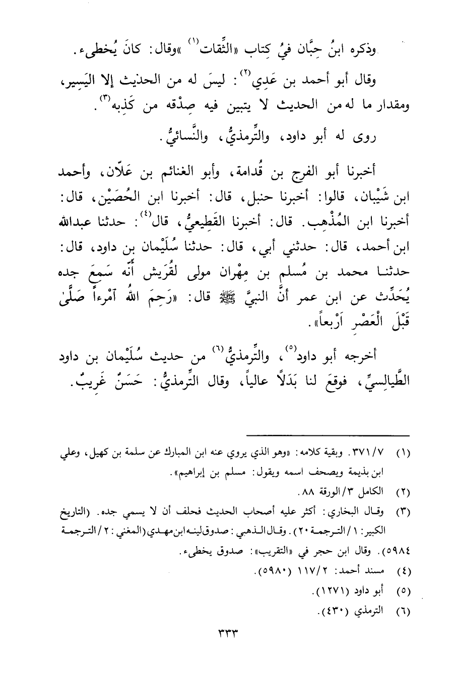 أخبرنا أَبُو الْفَرَجِ بْنُ قُدَامَةَ، وأَبُو الْغَنَائِمِ بْنُ عَلانَ، وأَحْمَدُ بْنُ شَيْبَانَ، قَالُوا: أخبرنا حنبل، قال: أخبرنا ابن الْحُصَيْنِ، قال: أخبرنا ابْنُ الْمُذْهِب. قال: أخبرنا القَطِيعِيّ، قال (4) : حَدَّثَنَا عَبد اللَّهِ بْن أَحْمَدَ، قال: حَدَّثني أَبِي، قال: حَدَّثَنَا سُلَيْمان بْنُ دَاوُدَ، قال: حَدَّثَنَا مُحَمَّدُ بْنُ مُسْلِمِ بْنِ مِهْرَانَ مَوْلًى لِقُرَيْشٍ إِنَّهُ سَمِعَ جَدَّهُ يُحَدِّثُ عَنِ ابْنِ عُمَر أَنَّ النَّبِيَّ صلى الله عليه وسلم قال: رحم الله امرءا صَلَّى قَبْلَ الْعَصْرِ أَرْبَعًا.
