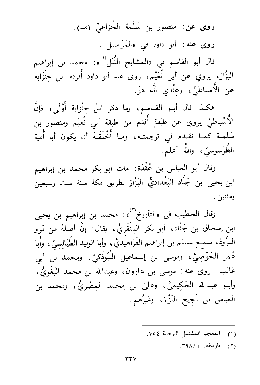 قال أَبُو الْقَاسِم في "المشايخ النبل (1) ": مُحَمَّد بْن إِبْرَاهِيم البزاز، يروي عَن أَبِي نُعَيْم، روى عنه أَبُو داود أفرده ابن حنزابة عَن الأسباطي، وعندي إنه هُوَ.