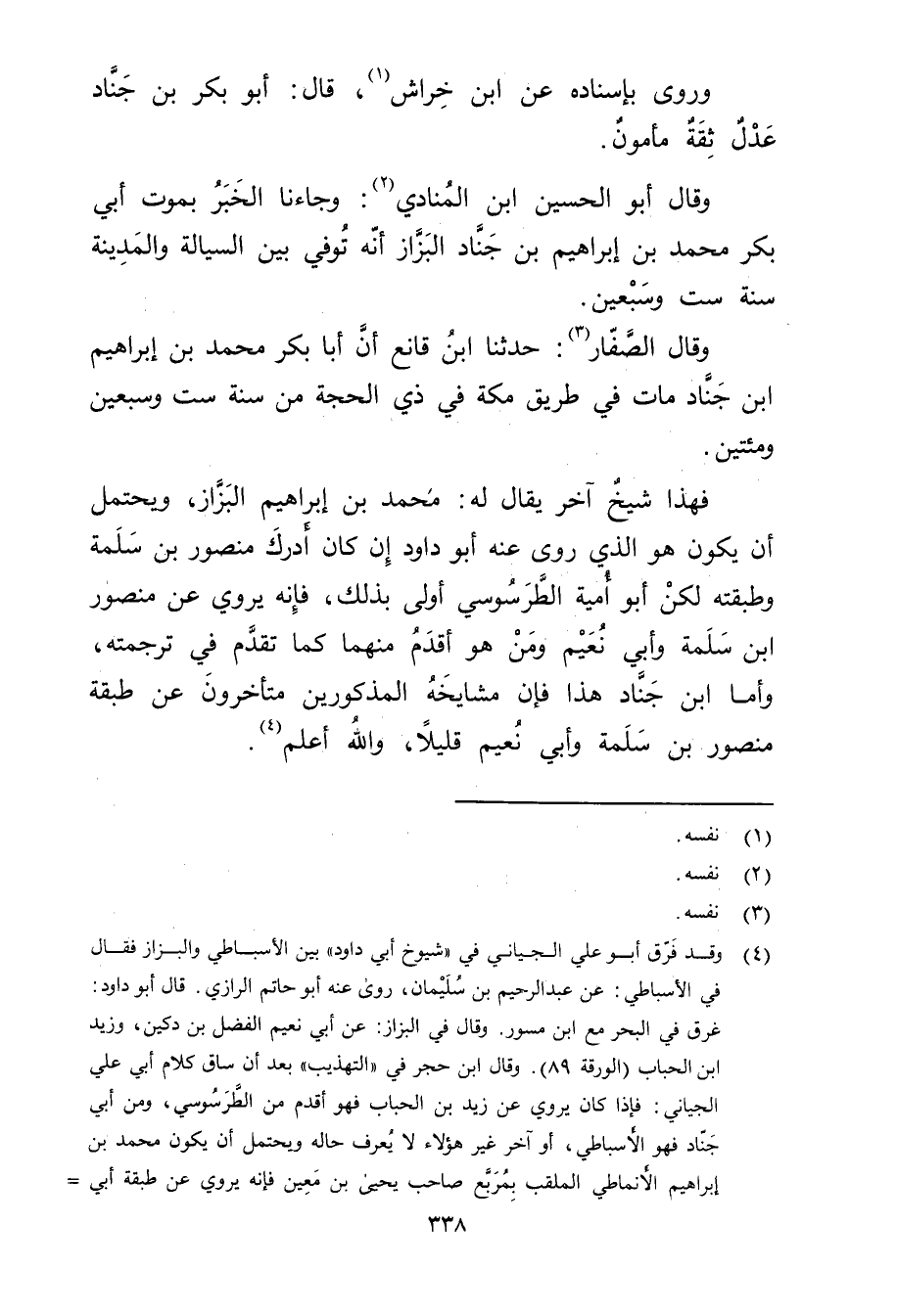 فهذا شيخ آخر يقال له: مُحَمَّد بْن إِبْرَاهِيم البزاز، ويحتمل أن يكون هُوَ الذي روى عنه أَبُو دَاوُد إن كَانَ أدرك مَنْصُور بْن سلمة وطبقته لكن أَبُو أمية الطرسوسي أولى بذلك، فإنه يروي عَنْ مَنْصُور ابن سلمة وأَبِي نُعَيْم ومن هُوَ أقدم منهما كما تقدم في ترجمته، وأما ابن جناد هَذَا فإن مشايخه المذكورين متأخرون عَنْ طبقة مَنْصُور بْن سلمة وأَبِي نُعَيْم قليلا، والله أعلم (4) .
