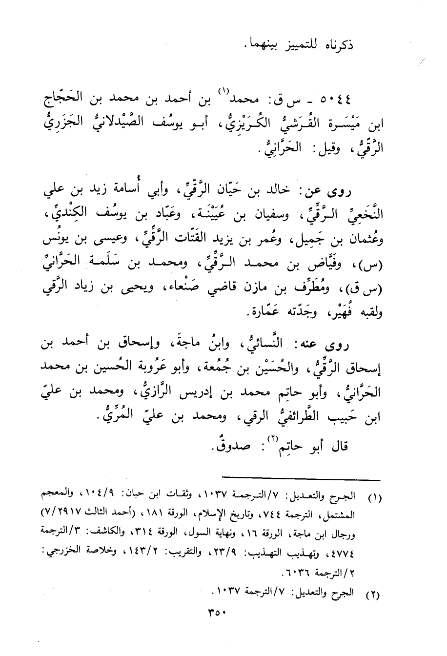 5044 - س ق: مُحَمَّدُ بْنُ أَحْمَدَ بْنِ مُحَمَّدِ بن الحجاج ابن ميسرة القرشي الكريزي (1) ، أَبُو يوسف الصَّيْدَلانِيّ الْجَزَرِيّ الرَّقِّيّ، وقيل: الْحَرَّانِيّ.