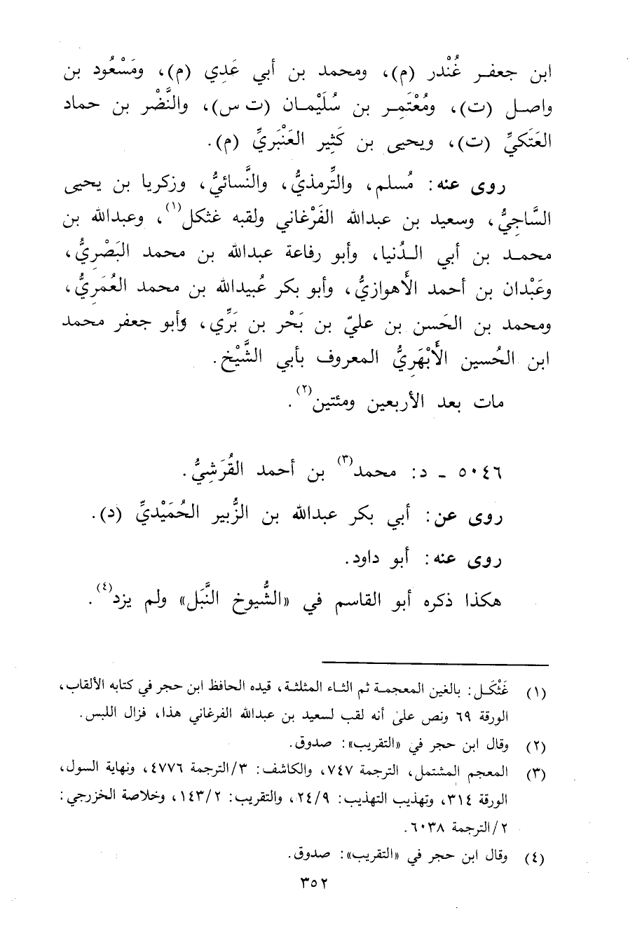 (1) غثكل: بالغين المعجمة ثم الثاء المثلثة، قيده الحافظ ابن حجر في كتابه الالقاب، الورقة 69 ونص على أنه لقب لسَعِيد بن عَبد الله الفرغاني هذا، فزال اللبس.