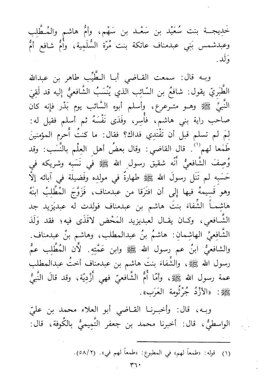 وبه قال: سمعت الْقَاضِي أَبَا الطيب طَاهِر بْن عَبد اللَّهِ الطبري يَقُول: شافع بْن السَّائِب الذي ينسب الشافعي إليه قد لقي النَّبِيّ صَلَّى اللَّهُ عَلَيْهِ وسَلَّمَ وهو مترعرع، وأسلم أبوه السَّائِب يَوْم بدر فإنه كَانَ صاحب راية بني هاشم، فأسر، وفدى نفسه ثُمَّ أسلم فقيل له: لم لم تسلم قبل أن تفتدي فداك؟ فَقَالَ: مَا كنت أحرم المؤمنين طمعا لهم (1) . قال الْقَاضِي: وَقَال بعض أهل العلم بالنسب: وقد وصف الشافعي أَنَّهُ شَقِيق رَسُول اللَّهِ صلى الله عليه وسلم في نسبه وشَرِيكه في حسبه لم تنل رَسُول اللَّهِ صلى الله عليه وسلم طهارة في مولده وفضيلة في آبائه إِلا وهُوَ قسيمه فِيهَا إِلَى أن افترقا من عبد مناف، فزوج المطلب ابنه هاشما الشفاء بْنت هاشم بْن عبد مناف فولدت له عبد يَزِيد جد الشافعي، وكان يقال لعبد يَزِيد المحض لاقذى فيه، فقد ولد الشافعي الهاشمان: هاشم بن عبد المطلب، وهاشم بْن عبد مناف. والشافعي ابن عم رَسُول اللَّهِ صَلَّى الله عليه وسلم وابْن عمته. لأن المطلب عم رَسُول اللَّهِ صلى الله عليه وسلم، والشفاء بْنت هاشم بْن عبد مناف أخت عبد المطلب عمة رَسُول اللَّهِ صلى الله عليه وسلم، وأما أم الشافعي فهي أزدية، وقد قال النَّبِيّ صَلَّى اللَّهُ عَلَيْهِ وسَلَّمَ: "الأزد جرثومة العرب.