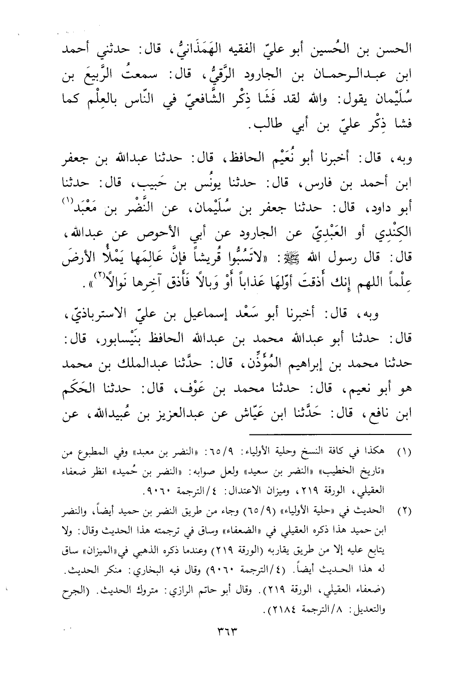 وبِهِ، قال: أخبرنا أَبُو نعيم الحافظ، قال: حَدَّثَنَا عَبد الله بْنُ جَعْفَرِ ابْنِ أَحْمَدَ بْنِ فَارِسٍ، قال: حَدَّثَنَا يُونُسُ بْنُ حَبِيبٍ، قال: حَدَّثَنَا أَبُو دَاوُدَ، قال: حَدَّثَنَا جَعْفَرُ بْنُ سُلَيْمان، عَنِ النَّضْرِ بْنِ مِعْبَدٍ (1) الْكِنْدِيِّ أَوِ الْعَبْدِيِّ عَنِ الْجَارُودِ عَن أبي الأَحوص عَن عَبد الله، قال: قال رَسُولُ اللَّهِ صلى الله عليه وسلم: "لاتسبوا قُرَيْشًا فَإِنَّ عَالِمَهَا يَمْلأُ الأَرْضَ عِلْمًا اللَّهُمَّ إِنَّكَ أَذَقْتَ أَوَّلَهَا عَذَابًا أَوْ وبَالا فَأَذِقْ آخِرَهَا نَوَالا (2) .