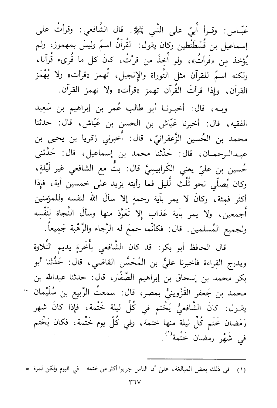 قال الْحَافِظُ أَبُو بَكْرٍ: قَدْ كَانَ الشافعي بأخرة يديم التلاوة ويدرج القراءة فأخبرنا علي بْن الْمُحْسِن الْقَاضِي، قال: حَدَّثَنَا أَبُو بَكْر مُحَمَّد بْن إسحاق بْن إِبْرَاهِيم الصَّفَّار، قال: حَدَّثَنَا عَبد الله بْن مُحَمَّد بْن جَعْفَر القزويني بمصر، قال: سمعت الربيع بْن سُلَيْمان يَقُول: كَانَ الشافعي يختم في كل ليلة ختمة، فإذا كَانَ شهر رمضان ختم كل ليلة منها ختمة، وفي كل يَوْم ختمة، فكان يختم في شهر رمضان ختمة (1) .