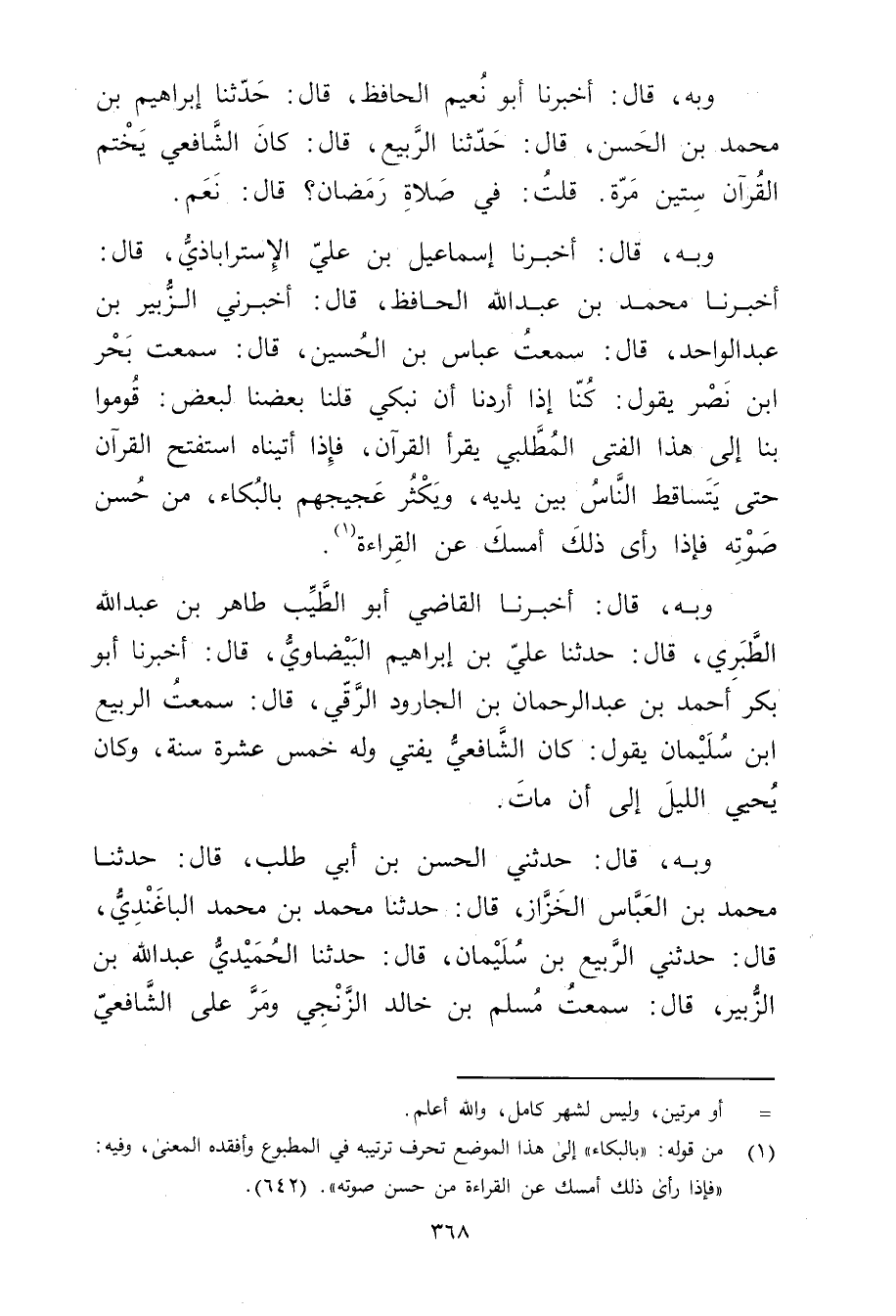 (1) من قوله: "بالبكاء "إلى هذا الموضع تحرف ترتيبه في المطبوع وأفقده المعنى، وفيه: "فإذا رأى ذلك أمسك عَنِ القراءة من حسن صوته " (642) .
