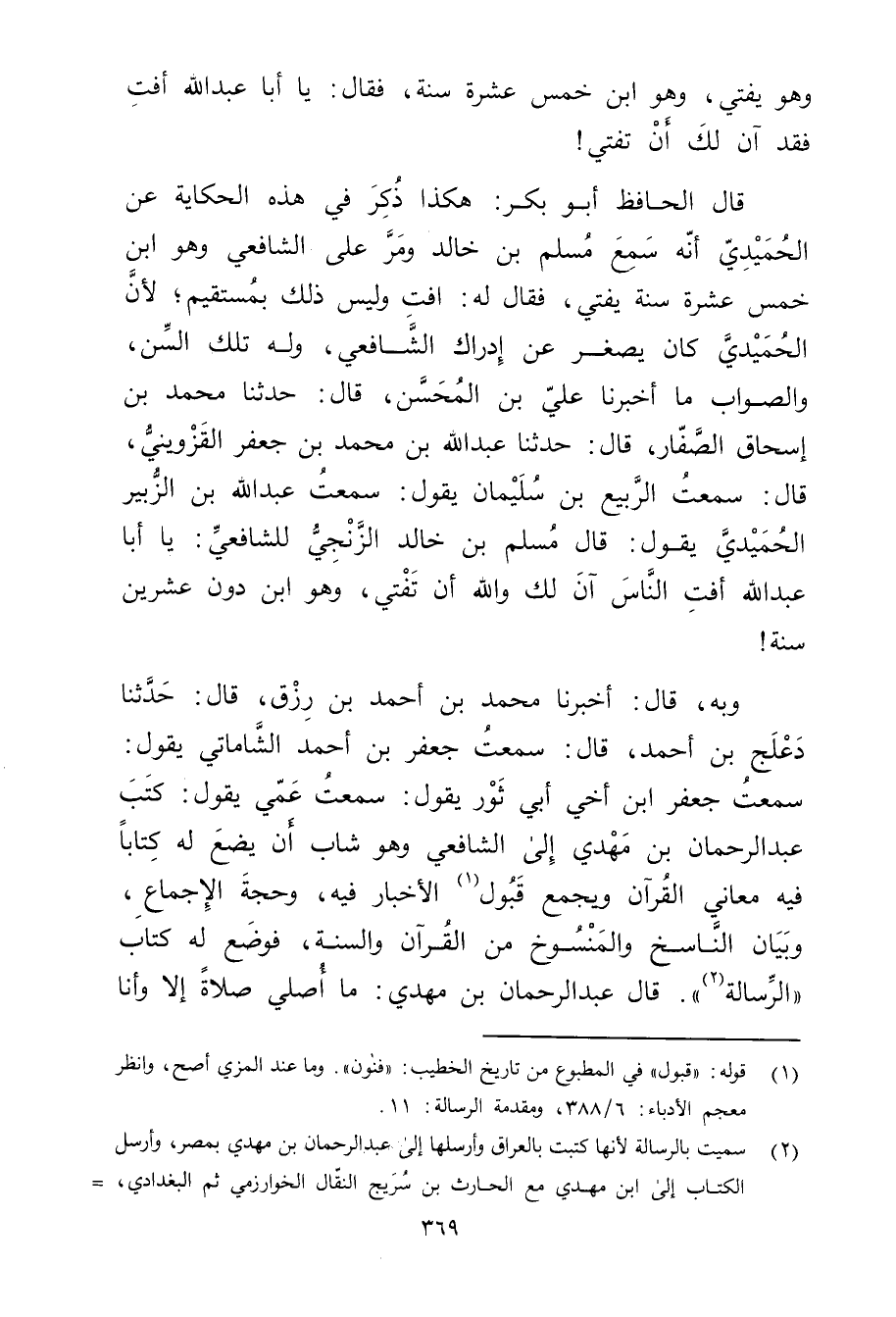 قال الْحَافِظ أَبُو بَكْر: هكذا ذكر في هذه الحكاية عَنِ الحميدي أَنَّهُ سمع مُسْلِم بْن خَالِد ومر على الشافعي وهُوَ ابْن خمس عشرة سنة يفتي، فَقَالَ له: افت وليس ذلك بمستقيم، لأن الحميدي كَانَ يصغر عَنْ إدراك الشافعي، وله تلك السن، والصواب مَا أخبرنا علي بْن الْمُحْسِن، قال: حَدَّثَنَا مُحَمَّد بْن إسحاق الصَّفَّارُ، قال: حَدَّثَنَا عَبد اللَّهِ بْن مُحَمَّد بْن جَعْفَر القزويني، قال: سمعت الربيع بْن سُلَيْمان يَقُول: سمعت عَبد اللَّهِ بْن الزبير الحميدي يَقُول: قال مُسْلِم بْن خَالِد الزنجي للشافعي: يَا أَبَا عَبد اللَّهِ أفت الناس آن لك والله أن تفتي، وهُوَ ابْن دون عشرين سنة!.