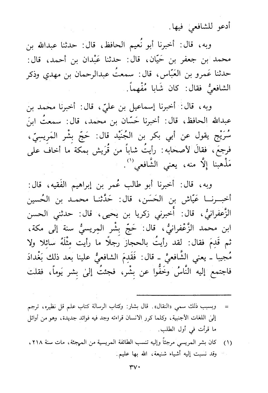 وبه، قال: أخبرنا أبو طالب عُمَربن إِبْرَاهِيم الفقيه، قال: أخبرنا عياش بْن الْحَسَن، قال: حَدَّثَنَا مُحَمَّد بْن الْحُسَيْن الزعفراني، قال: أَخْبَرَنِي زكريا بْن يَحْيَى، قال: حَدَّثَنِي الْحَسَن بْن مُحَمَّدٍ الزعفراني، قال: حج بشر المريسي سنة إِلَى مكة، ثُمَّ قدم فَقَالَ: لقد رأيت بالحجاز رجلا مَا رأيت مثله سائلا ولا مجيبا، يَعْنِي الشافعي، قال: فقدم الشافعي علينا بعد ذلك بغداد فاجتمع إليه الناس وخفوا عَنْ بشر، فجئت إِلَى بشر يوما، فقلت