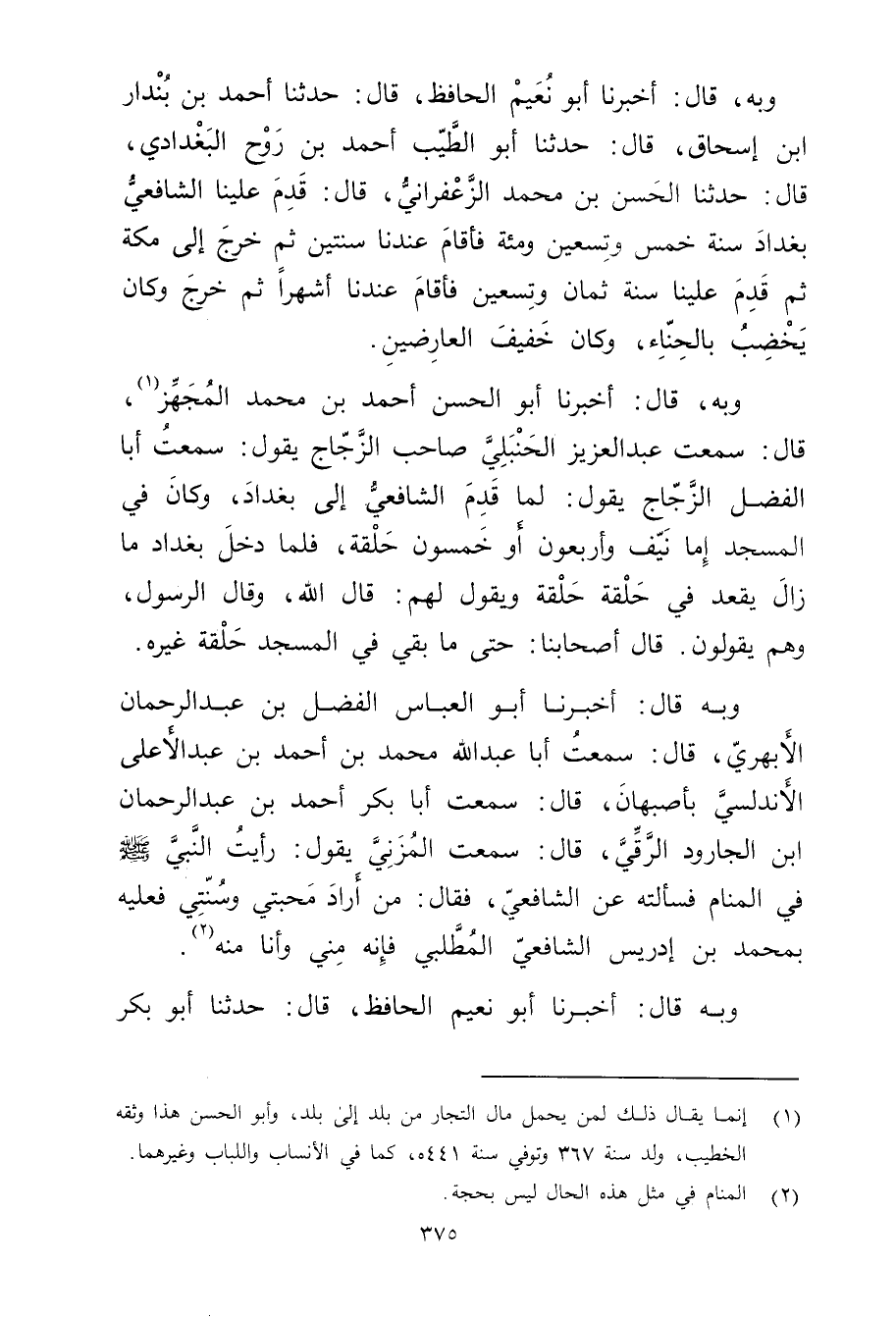 وبه، قال: أَخْبَرَنَا أَبُو نُعَيْمٍ الْحَافِظُ، قال: حَدَّثَنَا أَحْمَدُ بْنُ بندار ابْن إِسْحَاقَ، قال: حَدَّثَنَا أَبُو الطيب أَحْمَد بْن روح البغدادي، قال: حَدَّثَنَا الْحَسَنُ بْنُ مُحَمَّد الزعفراني، قال: قدم علينا الشافعي بغداد سنة خمس وتسعين ومئة فأقام عندنا سنتين ثُمَّ خرج إِلَى مكة ثُمَّ قدم علينا سنة ثمان وتسعين فأقام عندنا أشهرا ثُمَّ خرج وكان يخضب بالحناء، وكان خفيف العارضين.