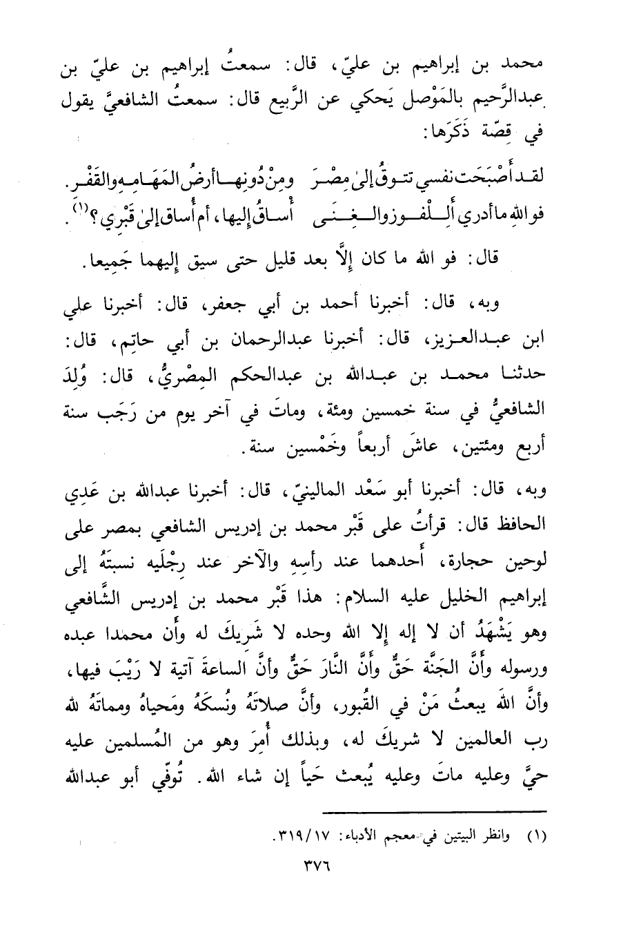 وبه، قال: أَخْبَرَنَا أَبُو سعد الماليني، قال: أَخْبَرَنَا عَبد الله بْن عدي الْحَافِظ قال: قرأت على قبر مُحَمَّد بْن إدريس الشافعي بمصر على لوحين حجارة، أحدهما عند رأسه والآخر عند رجليه نسبته إِلَى إِبْرَاهِيم الخليل عَلَيْهِ السلام: هَذَا قبر مُحَمَّد بْن إدريس الشافعي وهُوَ يشهد أن لا إله إلا اللَّه وحده لا شَرِيك لَهُ وأَنَّ مُحَمَّدًا عبده ورسوله وإن الجنة حق وإن النار حق وأن الساعة آتية لاريب فِيهَا، وأن الله يبعث من في القبور، وأن صلاته ونسكه ومحياه ومماته لله رب العالمين لا شَرِيك له، وبذلك أمر وهُوَ من المسلمين عَلَيْهِ حي وعليه مات وعليه يبعث حيا إن شاء الله. توفي أَبُو عبد الله