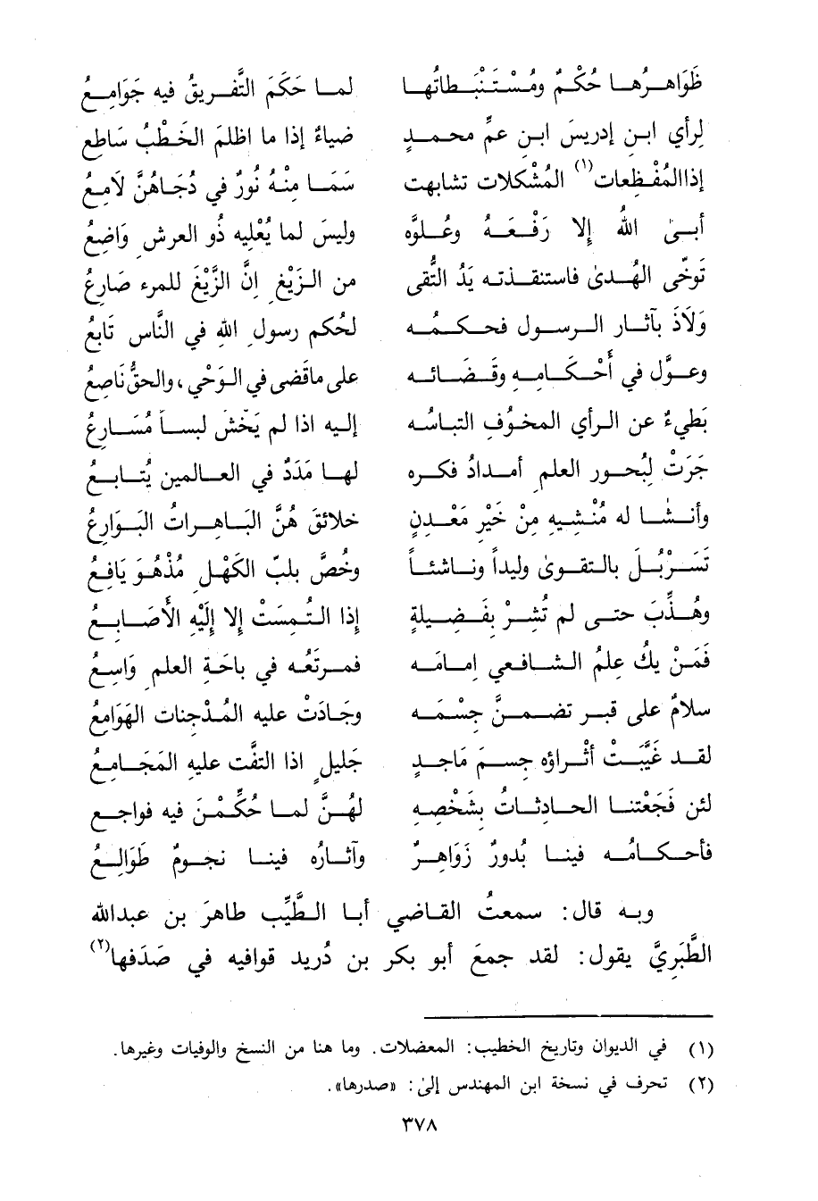 وبه قال: سمعت الْقَاضِي أَبَا الطيب طَاهِر بْن عَبد اللَّهِ الطبري يَقُول: لقد جمع أَبُو بَكْر بْن دريد قوافيه في صدفها (2)