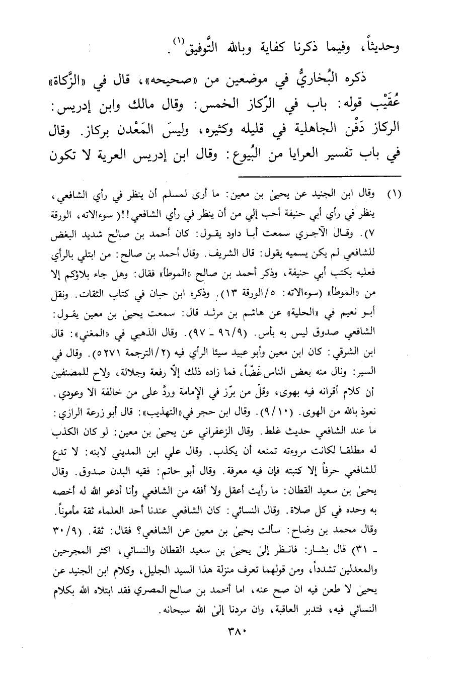 (1) وَقَال ابن الجنيد عَنْ يحيى بْن مَعِين: ما أرى لمسلم أن ينظر في رأي الشافعي، ينظر في رأي أبي حنيفة أحب إلي من أن ينظر في رأي الشافعي! ! (سوءالاته، الورقة 7) . وَقَال الآجُرِّيّ سمعت أَبَا داود يَقُول: كان أحمد بن صالح شديد البغض للشافعي لم يكن يسميه يقول: قال الشريف. وَقَال أحمد بن صالح، من ابتلي بالرأي فعليه بكتب أبي حنيفة، وذكر أحمد بن صالح "الموطأ "فقال: وهل جاء بلاؤكم إلا من "الموطأ " (سوءالاته: 5 / الورقة 13) ، وذَكَره ابنُ حِبَّان في كتاب الثقات. ونقل أبو نعيم في "الحلية "عن هاشم بن مرثد قال: سمعت يحيي بن مَعِين يقول: الشافعي صدوق ليس به بأس. (9 / 96 - 97) . وَقَال الذهبي في "المغني ": قال ابن الشرقي: كان ابن مَعِين وأبو عُبَيد سيئا الرأي فيه (2 / الترجمة 5271) . وَقَال في السير: ونال منه بعض الناس غضا، فما زاده ذلك إلا رفعة وجلالة، ولاح للمصنفين أن كلام أقرانه فيه بهوى، وقل من برز في الإمامة ورد على من خالفة الا وعودي. نعوذ بالله من الهوى. (10 / 9) . وَقَال ابن حجر في "التهذيب ": قال أبو زُرْعَة الرازي: ما عند الشافعي حديث غلط. وَقَال الزعفراني عن يحيى بن مَعِين: لو كان الكذب له مطلقا لكانت مروءته تمنعه أن يكذب. وَقَال علي ابن المديني لابنه: لا تدع للشافعي حرفا إلا كتبه فإن فيه معرفة. وَقَال أبو حاتم: فقيه البدن صدوق. وَقَال يحيى بن سَعِيد القطان: ما رأيت أعقل ولا أفقه من الشافعي وأنا أدعو الله له أخصه به وحده في كل صلاة. وَقَال النَّسَائي: كان الشافعي عندنا أحد العلماء ثقة مأمونا. وَقَال محمد بن وضاح: سألت يحيي بن مَعِين عن الشافعي؟ فقال: ثقة. (9 / 30 - 31) قال بشار: فانظر إلى يحيى بن سَعِيد القطان والنَّسَائي، اكثر المجرحين والمعدلين تشددا، ومن قولهما تعرف منزلة هذا السيد الجليل، وكلام ابن الجنيد عن يحيى لا طعن فيه ان صح عنه، اما أحمد بن صالح المِصْرِي فقد ابتلاه الله بكلام النَّسَائي فيه، فتدبر العاقبة، وان مردنا إلى الله سبحانه.
