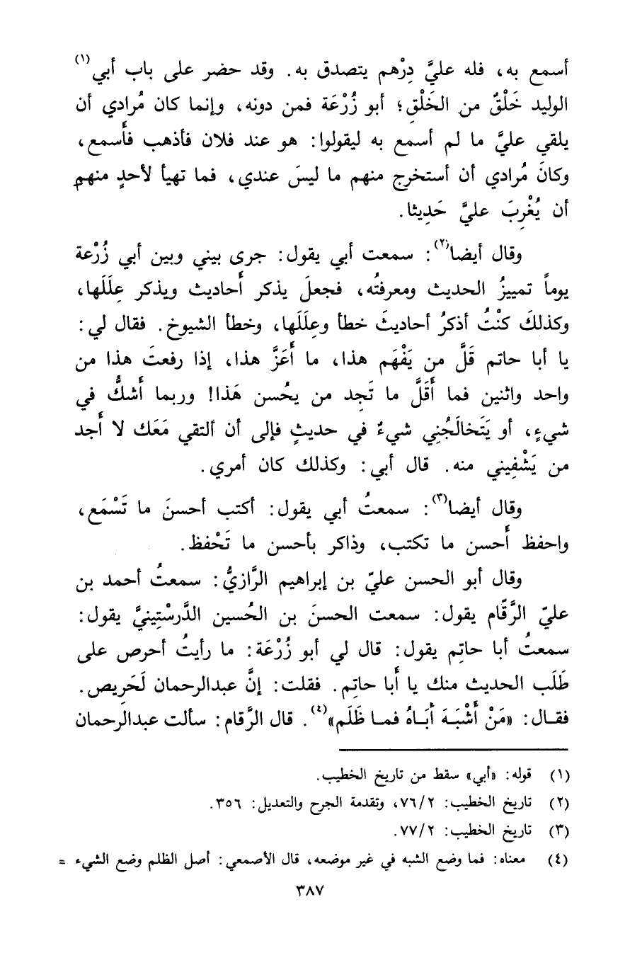 وَقَال أَبُو الْحَسَن علي بْن إِبْرَاهِيم الرازي: سمعت أَحْمَد بْن علي الرقام يَقُول: سمعت الْحَسَن بْن الْحُسَيْن الدرستيني يَقُول: سمعت أَبَا حاتم يَقُول: قال لي أَبُو زُرْعَة: مَا رأيت أحرص على طلب الحديث منك يَا أَبَا حاتم. فقلت: إن عَبْد الرَّحْمَنِ لحريص. فَقَالَ: "من أشبه أَبَاهُ فما ظلم " (4) . قال الرقام: سألت عبد الرحمن