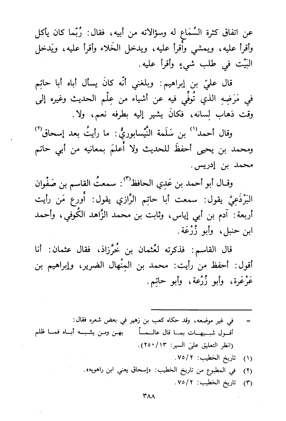 قال الْقَاسِم: فذكرته لعثمان بْن خرزاذ، فَقَالَ عُثْمَان: أنا أقول: أحفظ من رأيت: مُحَمَّد بْن المنهال الضرير، وإبراهيم بْن عرعرة، وأَبُو زُرْعَة، وأبو حاتم.