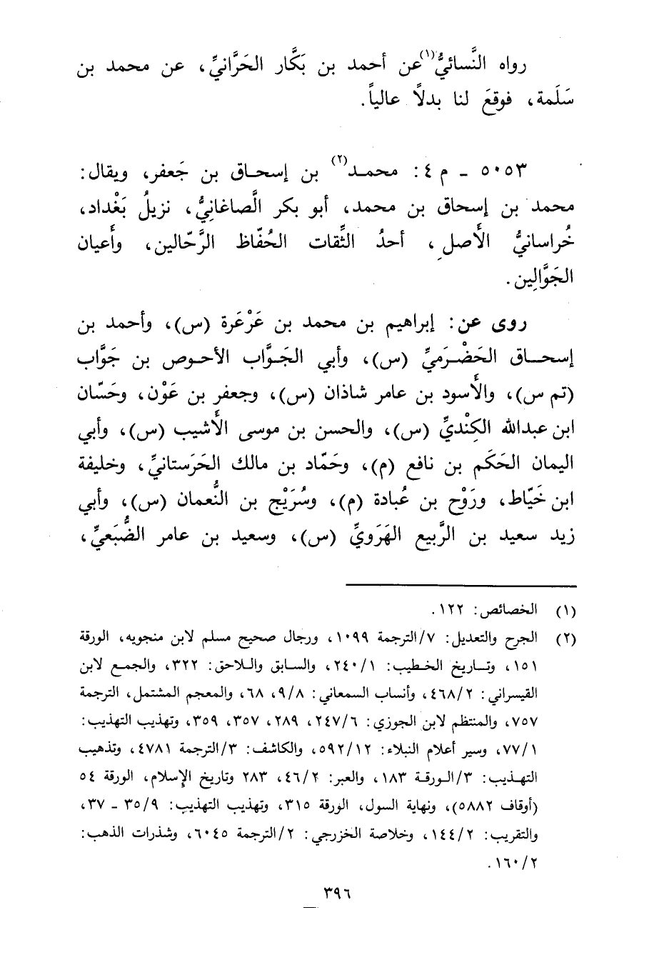 (2) الجرح والتعديل: 7 / الترجمة 1099، ورجال صحيح مسلم لابن منجويه، الورقة 151، وتاريخ الخطيب: 1 / 240، والسابق واللاحق: 322، والجمع لابن القيسراني: 2 / 468، وأنساب السمعاني: 8 / 9، 68، والمعجم المشتمل، الترجمة 757، والمنتظم لابن الجوزي: 6 / 247، 289، 357، 359، وتهذيب التهذيب: 1 / 77، وسير أعلام النبلاء: 12 / 592، والكاشف: 3 / الترجمة 4781، وتذهيب التهذيب: 3 / الورقة 183، والعبر: 2 / 46، 283، وتاريخ الاسلام، الورقة 54