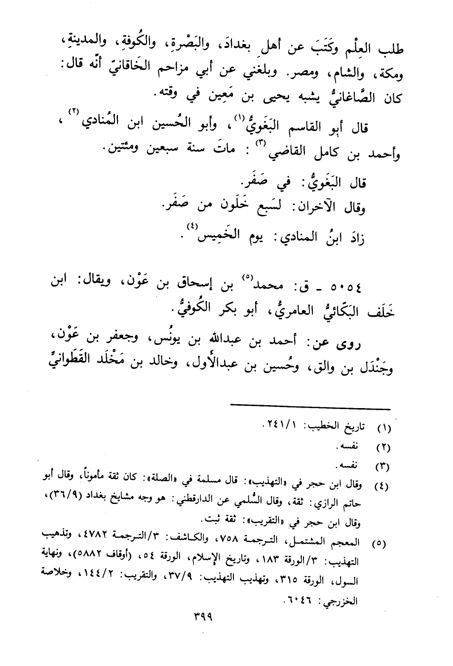 (5) المعجم المشتمل، الترجمة 758، والكاشف: 3 / الترجمة 4782، وتذهيب التهذيب: 3 / الورقة 183، وتاريخ الاسلام، الورقة 54، (أوقاف 5882) : ونهاية السول، الورقة 315، وتهذيب التهذيب: 9 / 37، والتقريب: 2 / 144، وخلاصة الخزرجي: 6046.