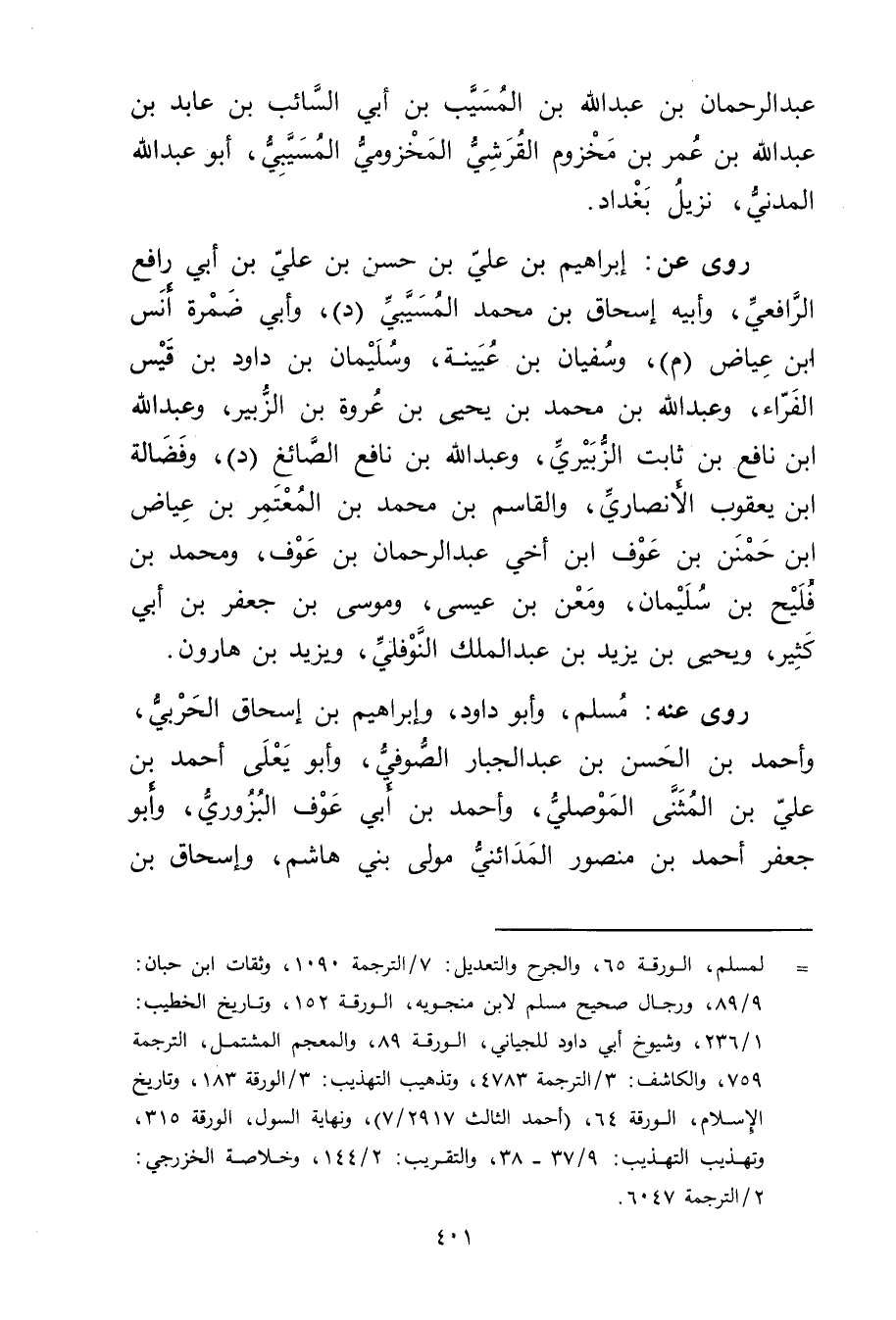 = لمسلم، الورقة 65، والجرح والتعديل: 7 / الترجمة 1090، وثقات ابن حبان: 9 / 89، ورجال صحيح مسلم لابن منجويه، الورقة 152، وتاريخ الخطيب: 1 / 236، وشيوخ أبي داود للجياني، الورقة 89، والمعجم المشتمل، الترجمة 759، والكاشف: 3 / الترجمة 4783، وتذهيب التهذيب: 3 / الورقة 183، وتاريخ الاسلام، الورقة 64، (أحمد الثالث 2917 / 7) ، ونهاية السول، الورقة 315، وتهذيب التهذيب: 9 / 37 - 38، والتقريب: 2 / 144، وخلاصة الخزرجي: 2 / الترجمة 6047.