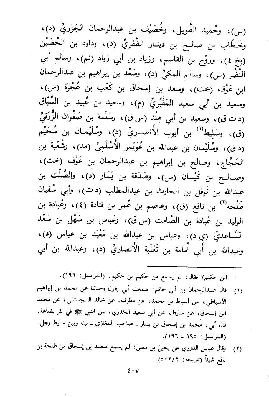 (1) قال عَبْد الرَّحْمَنِ بْن أَبي حاتم: سمعت أبي يقول وحَدَّثَنَا عن محمد بن إبراهيم الاسباطي، عَنِ اسباط بْن مُحَمَّد، عَنْ مطرف، عن خالد السجستاني، عن محمد ابن إسحاق، عن سليط، عَن أَبِي سَعِيد الخُدْرِيّ، عَنِ النَّبِيُّ صلى الله عليه وسلم في بئر بضاعة. قال أبي: مُحَمَّد بْن إسحاق بْن يسار - صاحب المغازي - بينه وبين سليط رجل. (المراسيل: 195 - 196) .