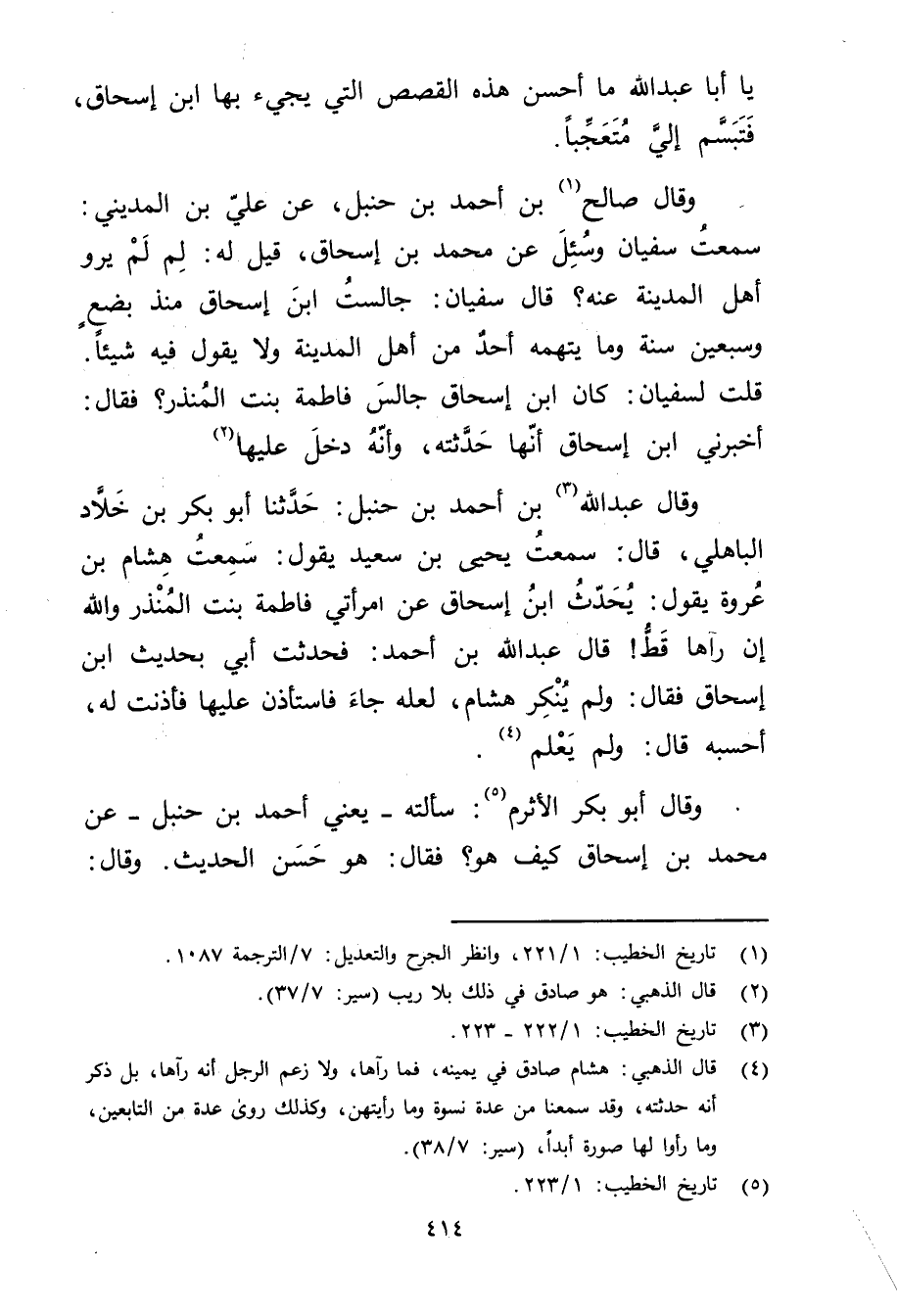 وَقَال عَبد اللَّهِ (3) بْن أَحْمَد بْن حَنْبَل: حَدَّثَنَا أَبُو بَكْر بْن خلاد الباهلي، قال: سمعت يَحْيَى بْن سَعِيد يقول: سمعت هشام بْن عروة يَقُول: يحدث ابن إِسْحَاق عَنِ امرأتي فَاطِمَة بِنْت المنذر والله إن رآها قط! قال عَبد اللَّهِ بْن أَحْمَد: فحدثت أَبِي بحديث ابْن إِسْحَاق فَقَالَ: ولم ينكر هشام، لعله جاء فاستأذن عليها فأذنت له أحسبه قال: ولم يعلم (4) .