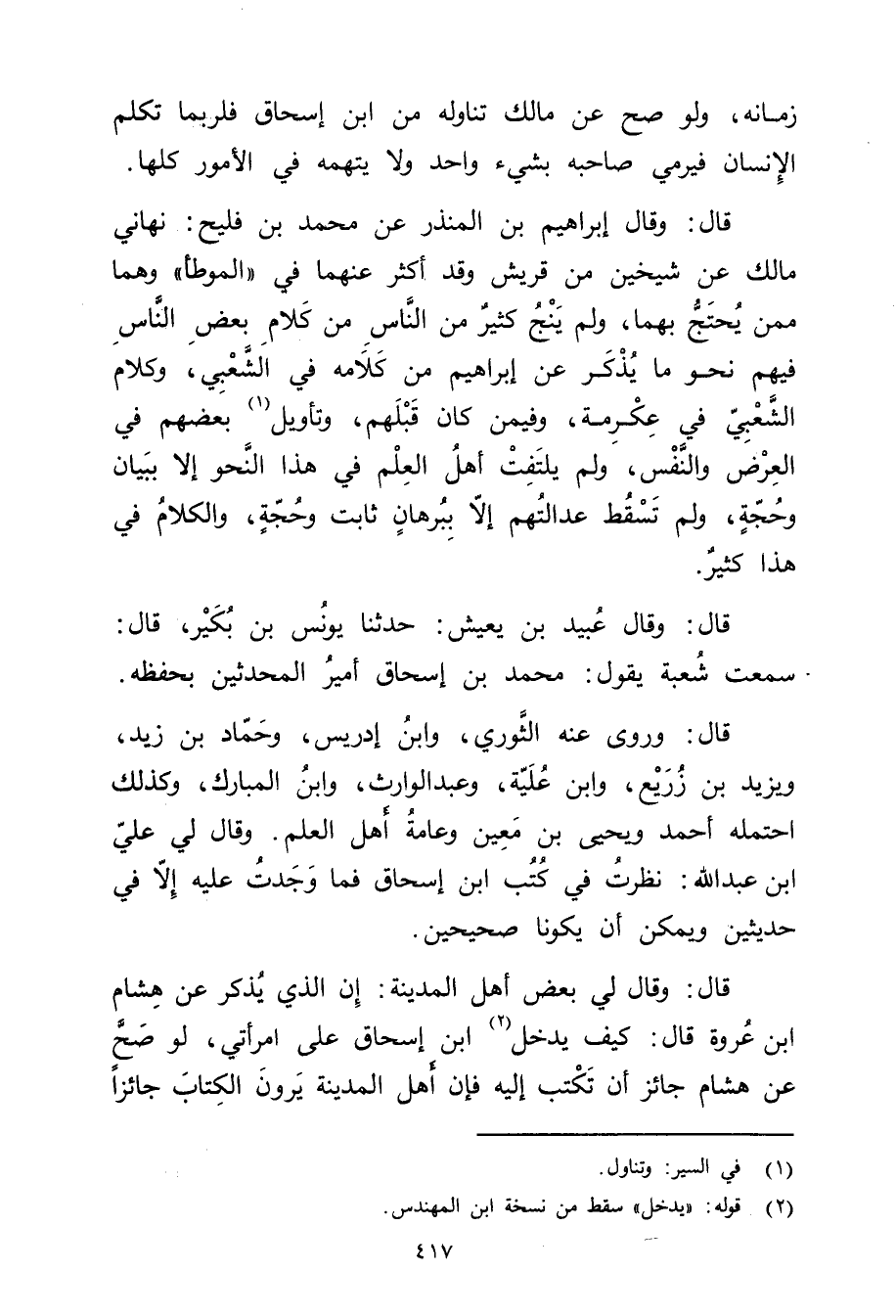 زمانه، ولو صح عَنْ مَالِك تناوله من ابْن إِسْحَاق فلربما تكلم الإنسان فيرمي صاحبه بشيءٍ واحِد ولا يتهمه في الأمور كلها.