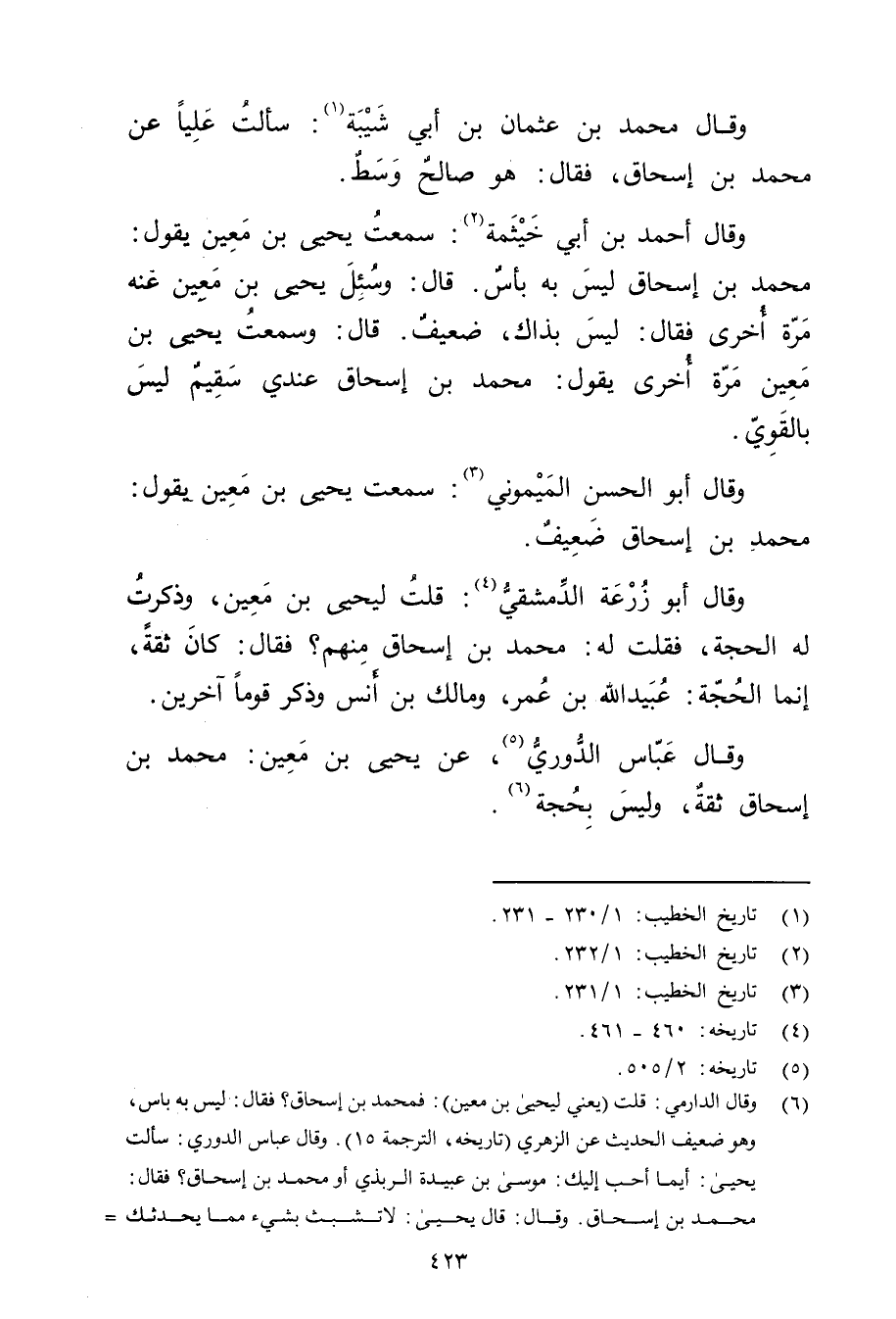 قال: وسئل يَحْيَى بْن مَعِين عنه مرة أخرى فَقَالَ: ليس بذاك، ضعيف. قال: وسمعت يحيى بن مَعِين مرة أخرى يَقُول: مُحَمَّد بْن إِسْحَاق عندي سقيم ليس بالقوي.