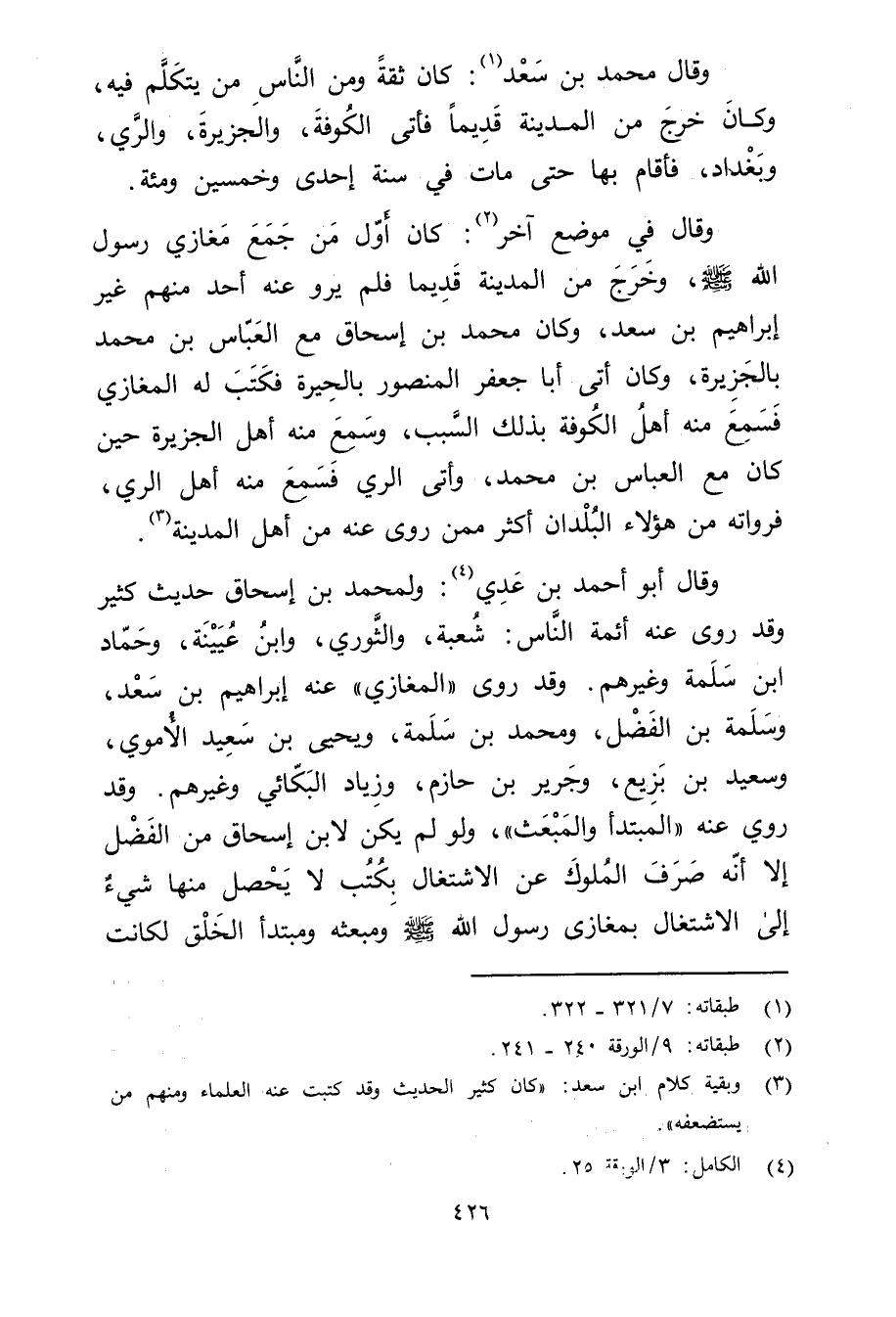 وَقَال فِي موضع آخر (2) : كَانَ أول من جمع مغازي رَسُول اللَّهِ صلى الله عليه وسلم، وخرج من المدينة قديما فلم يرو عَنْهُ أحد منهم غَيْر إِبْرَاهِيم بْن سَعْد، وكان مُحَمَّد بْن إِسْحَاق مع الْعَبَّاس بْن مُحَمَّد بالجزيرة، وكان أتى أَبَا جَعْفَر المنصور بالحيرة فكتب له المغازي فسمع منه أهل الكوفة بذلك السبب، وسمع منه أهل الجزيرة حين كَانَ مع الْعَبَّاس بْن مُحَمَّد، وأتى الري فسمع منه أهل الري، فرواته من هؤلاء البلدان أكثر ممن روى عنه من أهل المدينة (3) .
