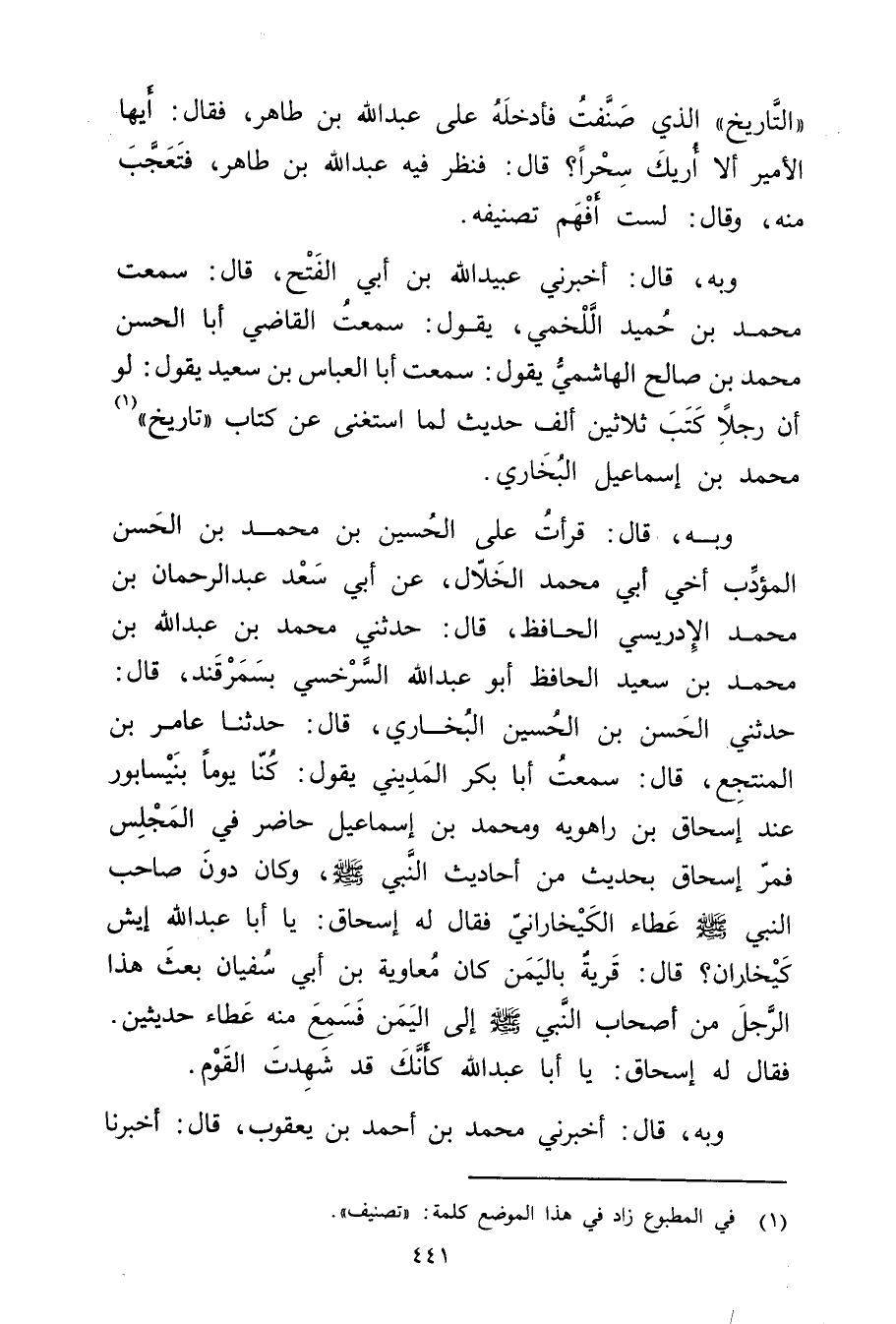 "التأريخ "الذي صنفت فأدخله على عَبد اللَّهِ بْن طَاهِر، فَقَالَ: أيها الأمير ألا أريك سحرا؟ قال: فنظر فيه عَبد اللَّهِ بْن طَاهِر، فتعجب منه، وَقَال: لست أفهم تصنيفه.