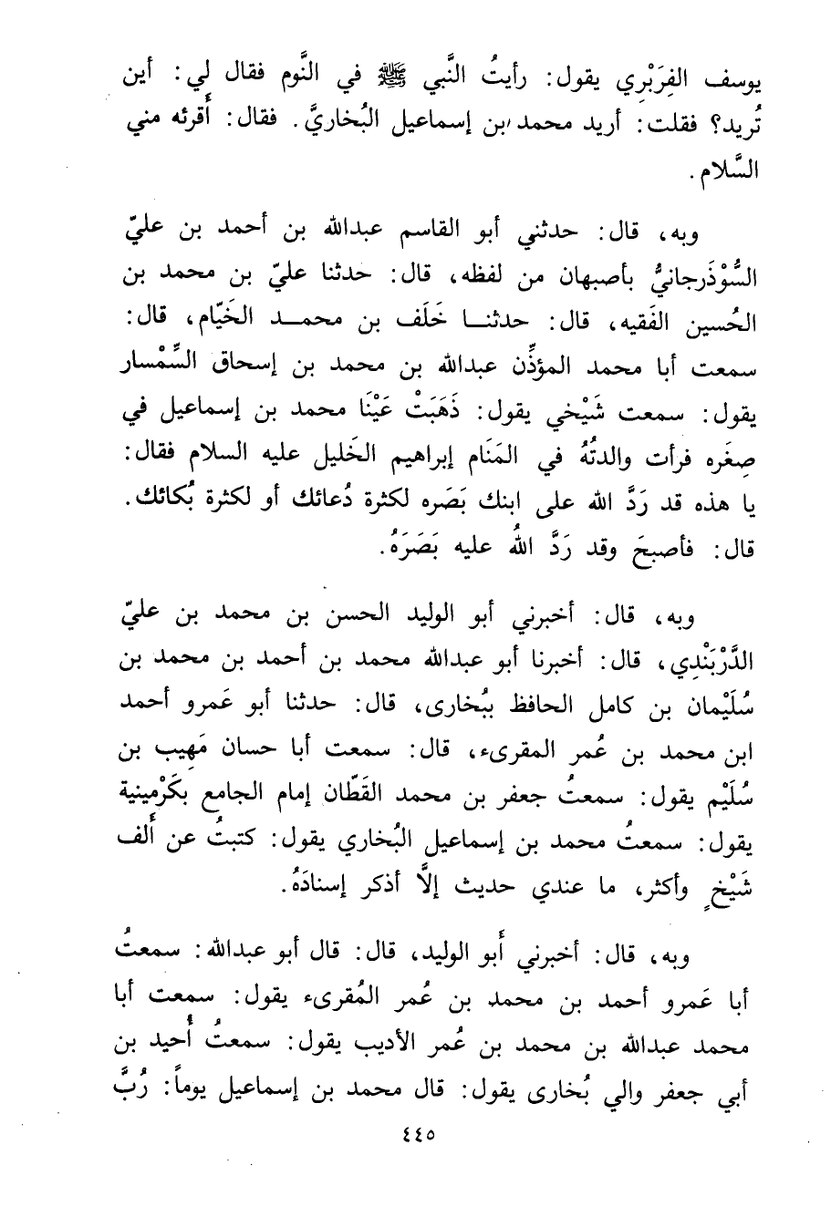 يوسف الفربري يَقُول: رأيت النَّبِيُّ صلى الله عليه وسلم في النوم فَقَالَ لي: أين تريد؟ فقلت: أريد مُحَمَّد بْن إِسْمَاعِيل الْبُخَارِيّ. فَقَالَ: أقرئه مني السلام.