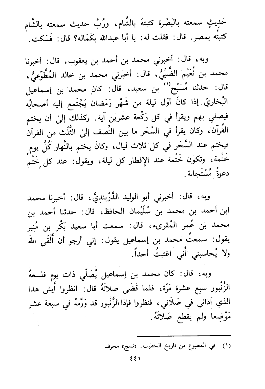 وبه، قال: أَخْبَرَنِي مُحَمَّد بْن أحمد بْن يعقوب، قال: أَخْبَرَنَا مُحَمَّد بْن نعيم الضبي، قال: أَخْبَرَنِي مُحَمَّد بْن خَالِد المطوعي، قال: حَدَّثَنَا مسبح (1) بْن سَعِيد، قال: كَانَ مُحَمَّد بْن إِسْمَاعِيل الْبُخَارِيّ إذا كَانَ أول ليلة من شهر رمضان يجتمع إليه أصحابه فيصلي بهم ويقرأ في كل ركعة عشرين آية. وكذلك إِلَى أن يختم القرآن، وكان يقرأ في السحر مَا بين النصف إِلَى الثلث من القرآن فيختم عند السحر في كل ثلاث ليال، وكان يختم بالنهار كل يَوْم ختمة، وتكون ختمة عند الإفطار كل ليلة، ويقول: عند كل ختم دعوة مستجابة.