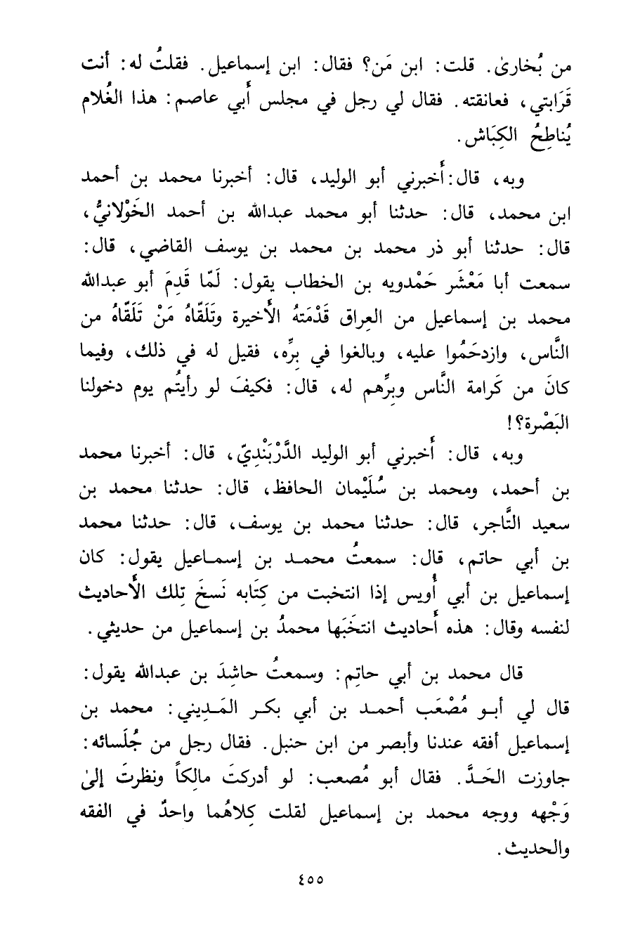 من بخاري. قلت: ابْن من؟ فَقَالَ: ابْن إِسْمَاعِيل. فقلت له: أنت قرابتي، فعانقته. فَقَالَ لي رجل في مجلس أَبِي عَاصِم: هَذَا الغلام يناطح الكباش.