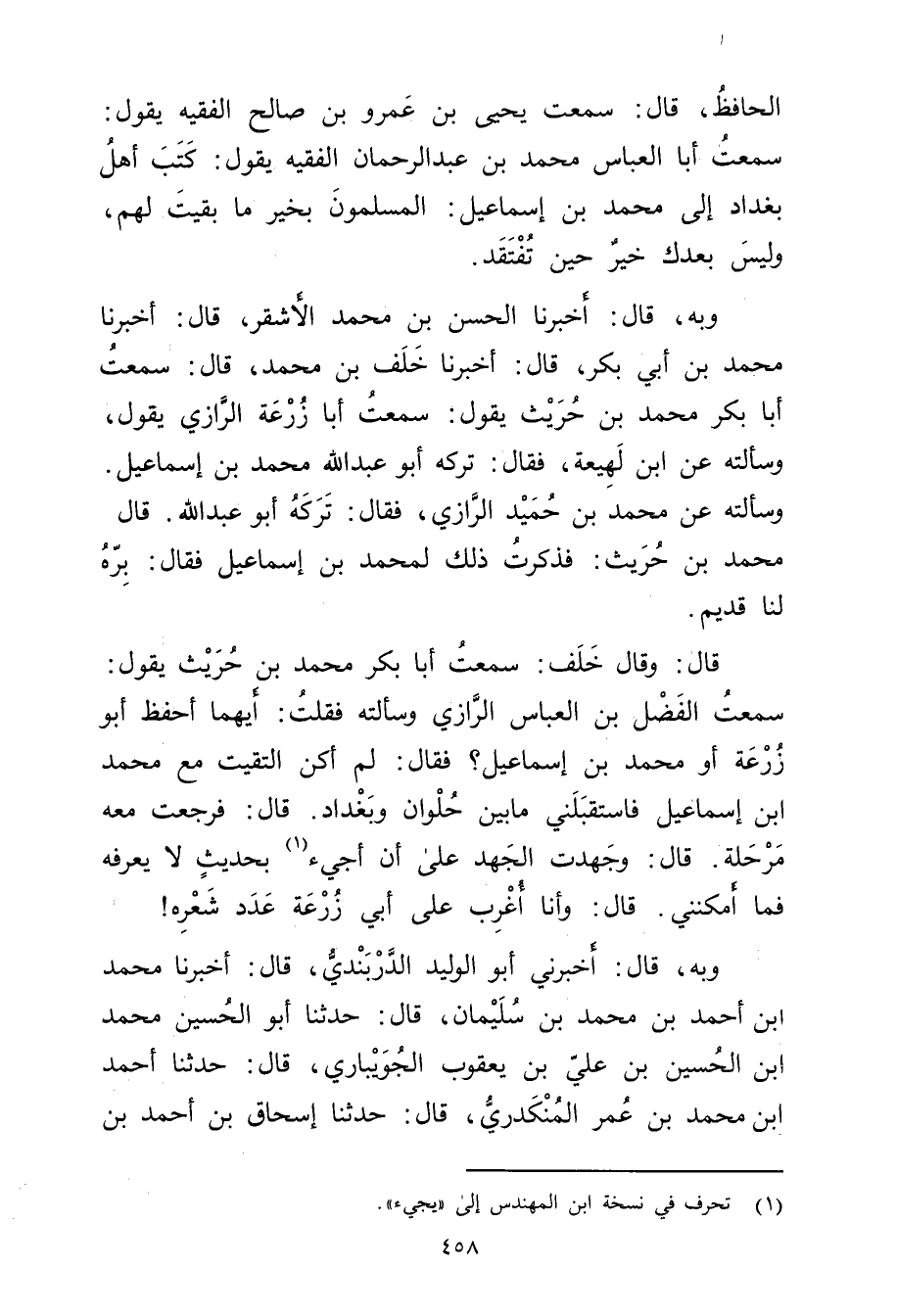 قال: وَقَال خلف: سمعت أَبَا بَكْر مُحَمَّد بْن حريث يَقُول: سمعت الْفَضْل بْن الْعَبَّاس الرازي وسألته فقلت: أيهما أحفظ أَبُو زُرْعَة أو مُحَمَّد بْن إِسْمَاعِيل؟ فَقَالَ: لم أكن التقيت مع محمد ابن إسماعيل فاستقبلني مابين حلوان وبغداد. قال: فرجعت معه مرحلة. قال: وجهدت الجهد على أن أجئ (1) بحديث لا يعرفه فما أمكنني. قال: وأنا أغرب على أَبِي زرعة عدد شعره! وبه، قال: أَخْبَرَنِي أَبُو الْوَلِيد الدربندي، قال: أخبرنا محمد ابن أحمد بْن مُحَمَّد بْن سُلَيْمان، قال: حَدَّثَنَا أَبُو الْحُسَيْنِ مُحَمَّدُ ابن الْحُسَيْن بْن علي بْن يَعْقُوب الجويباري، قال: حَدَّثَنَا أَحْمَد بْن مُحَمَّد بْن عُمَر المنكدري، قال: حَدَّثَنَا إِسْحَاقُ بْنُ أَحْمَدَ بْن