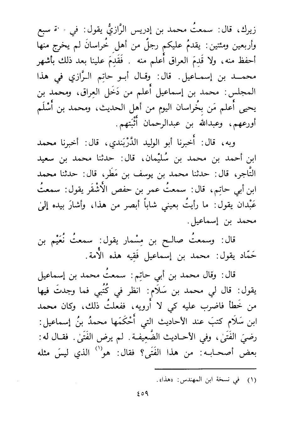 زيرك، قال: سمعت مُحَمَّد بْن إدريس الرازي يَقُول: في سنة سبع وأربعين ومئتين: يقدم عليكم رجل من أهل خراسان لم يخرج منها أحفظ منه، ولا قدم العراق أعلم منه. فقدم علينا بعد ذلك بأشهر مُحَمَّد بْن إِسْمَاعِيل. قال: وَقَال أَبُو حاتم الرازي في هَذَا المجلس: مُحَمَّد بْن إِسْمَاعِيل أعلم من دخل العراق، ومحمد بْن يَحْيَى أعلم من بخراسان اليوم من أهل الحديث، ومُحَمَّد بن أسلم أورعهم، وعَبْد اللَّهِ بْن عَبْد الرَّحْمَنِ أثبتهم.