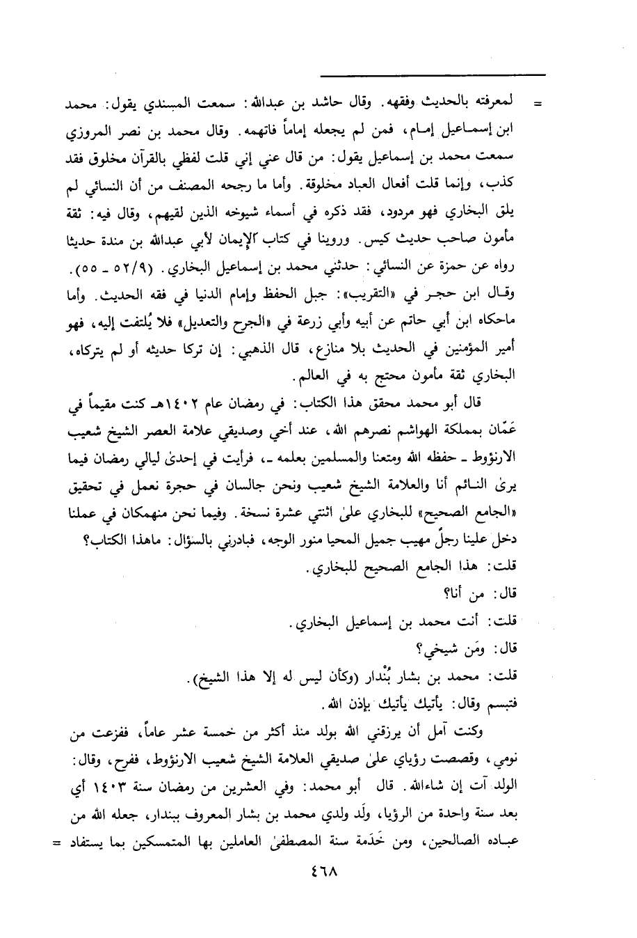 = لمعرفته بالحديث وفقهه. وَقَال حاشد بن عَبد الله: سمعت المسندي يقول: محمد ابن إسماعيل إمام، فمن لم يجعله إماما فاتهمه. وَقَال محمد بن نصر المروزي سمعت محمد بن إسماعيل يقول: من قال عني إني قلت لفظي بالقرآن مخلوق فقد كذب، وإنما قلت أفعال العباد مخلوقة. وأما ما رجحه المصنف من أن النَّسَائي لم يلق البخاري فهو مردود، فقد ذكره في أسماء شيوخه الذين لقيهم، وَقَال فيه: ثقة مأمون صاحب حديث كيس. وروينا في كتاب الايمان لابي عَبد الله بن مندة حديثًا رواه عن حمزة عن النَّسَائي: حدثني محمد بن إسماعيل البخاري. (9 / 52 - 55) . وَقَال ابن حجر في "التقريب": جبل الحفظ وإمام الدنيا في فقه الحديث. وأما ما حكاه ابن أَبي حاتم عَن أبيه وأبي زرعة في "الجرح والتعديل "فلا يلتفت إليه، فهو أمير المؤمنين في الحديث بلا منازع، قال الذهبي: إن تركا حديثه أو لم يتركاه، البخاري ثقة مأمون محتج به في العالم. قال أبو محمد محقق هذا الكتاب: في رمضان عام 1402 هـ كنت مقيما في عمان بمملكة الهواشم نصرهم الله، عند أخي وصديقي علامة العصر الشيخ شعيب الارنؤوط - حفظه الله ومتعنا والمسلمين بعلمه، فرأيت في إحدى ليالي رمضان فيما يرى النائم أنا والعلامة الشيخ شعيب ونحن جالسان في حجرة نعمل في تحقيق "الجامع الصحيح "للبخاري على اثنتي عشرة نسخة. وفيما نحن منهمكان في عملنا دخل علينا رجل مهيب جميل المحيا منور الوجه فبادرني بالسؤال: ما هذا الكتاب؟ قلت: هذا الجامع الصحيح للبخاري. قال: من أنا؟ قلت: أنت محمد بن إسماعيل البخاري. قال: ومن شيخي؟ قلت: محمد بن بشار بندار (وكأن ليس له إلا هذا الشيخ) . فتبسم وَقَال: يأتيك يأتيك بإذن الله. وكنت آمل أن يرزقني الله بولد منذ أكثر من خمسة عشر عاما، ففزعت من نومي، وقصصت رؤياي على صديقي العلامة الشيخ شعيب الارنؤوط، ففرح، وَقَال: الولد آت إن شاء الله. قال أبو محمد: وفي العشرين من رمضان سنة 1403 أي بعد سنة واحدة من الرؤيا، ولد ولدي محمد بن بشار المعروف ببندار، جعله الله من عباده الصالحين، ومن خدمة سنة المصطفى العاملين بها المتمسكين بما يستفاد =