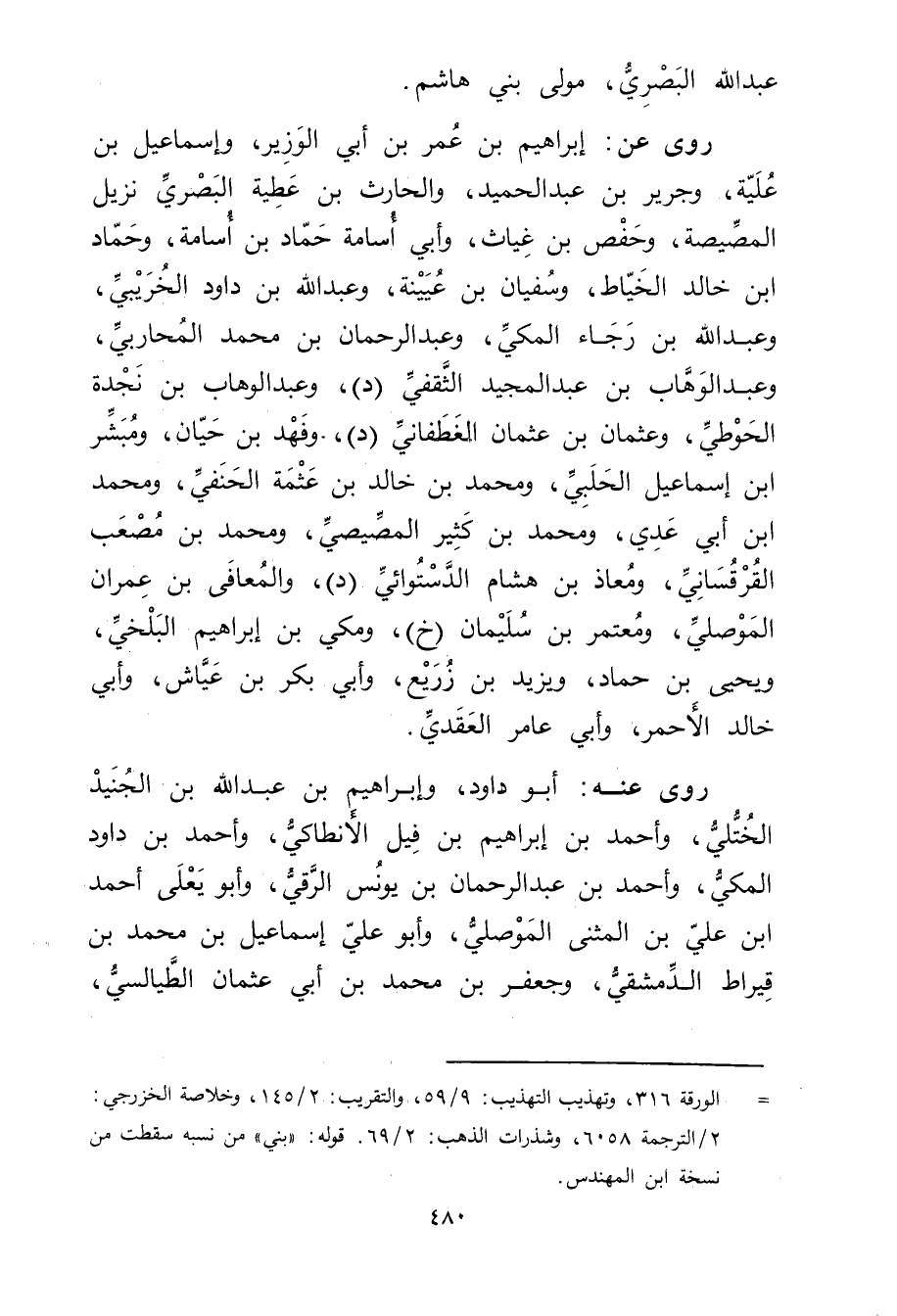 = الورقة 316، وتهذيب التهذيب: 9 / 59، والتقريب: 2 / 145، وخلاصة الخزرجي: 2 / الترجمة 6058، وشذرات الذهب: 2 / 69. قوله: "بني "من نسبه سقطت من نسخة ابن المهندس.