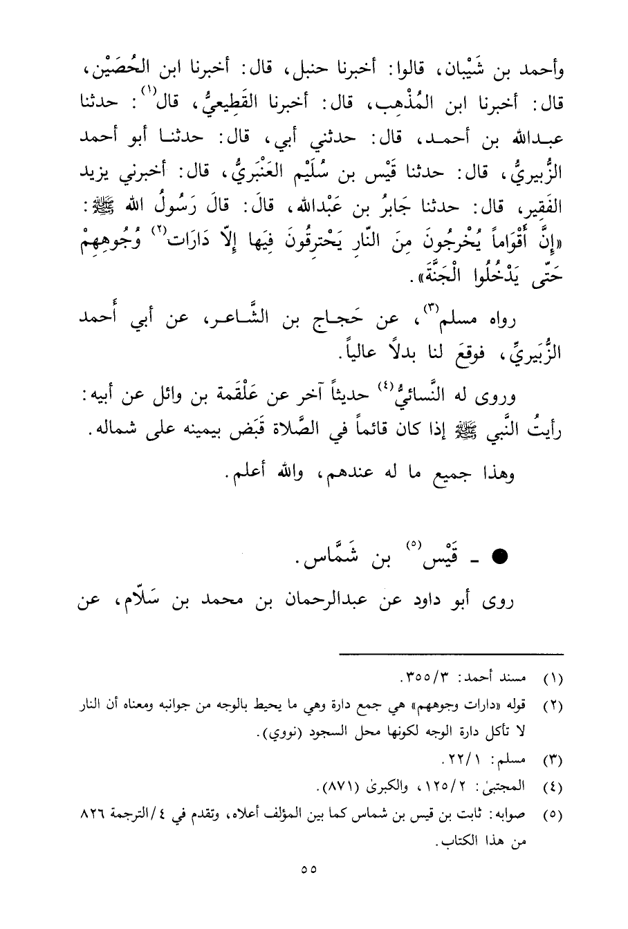 وأَحْمَدُ بْنُ شَيْبَانَ، قَالُوا: أَخْبَرَنَا حنبل، قال: أخبرنا ابن الحصين، قال: أخبرنا ابْنُ الْمُذْهِب، قال: أخبرنا القَطِيعِيّ، قال (1) : حَدَّثَنَا عَبد اللَّهِ بْن أَحْمَدَ، قال: حَدَّثني أبي، قال: حَدَّثَنَا أَبُو أَحْمَد الزُّبَيْرِيُّ، قال: حَدَّثَنَا قَيْسُ بْنُ سُلَيْمٍ الْعَنْبَرِيُّ، قال: أَخْبَرَنِي يَزِيدٌ الْفَقِيرُ، قال: حَدَّثَنَا جَابِرُ بْنُ عَبد اللَّهِ، قال: قال رَسُولُ اللَّهِ صلى الله عليه وسلم: "إِنَّ أَقْوَامًا يَخْرُجُونَ مِنَ النَّارِ يَحْتَرِقُونَ فِيهَا إِلا دَارَاتِ (2) وجُوهِهِمْ حَتَّى يَدْخُلُوا الْجَنَّةَ.