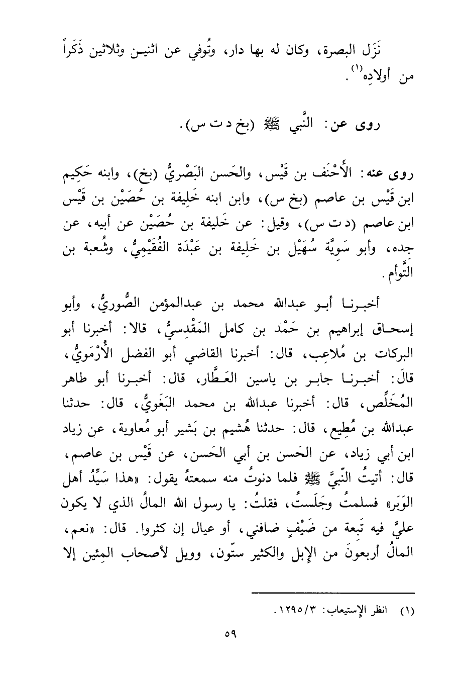 أَخْبَرَنَا أَبُو عَبْد اللَّهِ مُحَمَّد بن عبد المؤمن الصُّورِيُّ، وأَبُو إِسْحَاقَ إِبْرَاهِيمُ بْنُ حَمَدِ بْنِ كَامِلٍ الْمَقْدِسِيُّ، قَالا: أخبرنا أَبُو الْبَرَكَاتِ بْنُ مُلاعِبٍ، قال: أَخْبَرَنَا الْقَاضِي أَبُو الْفَضْلِ الأُرْمَوِيُّ، قال: أَخْبَرَنَا جَابِرُ بْنُ يَاسِينَ الْعَطَّارُ، قال: أَخْبَرَنَا أَبُو طَاهِرٍ الْمُخَلِّصُ، قال: أَخْبَرَنَا عَبد الله بْن مُحَمَّد البغوي، قال: حَدَّثَنَا عَبد اللَّهِ بْنُ مُطِيعٍ، قال: حَدَّثَنَا هُشَيْمِ بْنُ بَشِيرٍ أبو معاوية، عن زياد ابن أَبي زِيَادٍ، عَنِ الْحَسَنِ بْنِ أَبي الْحَسَنِ، عَنْ قَيْسِ بْنِ عَاصِمٍ، قال: أَتَيْتُ النَّبِيَّ صلى الله عليه وسلم فَلَمَّا دَنَوْتُ مِنْهُ سَمِعْتُهُ يَقُولُ: "هَذَا سَيِّدُ أَهْلِ الْوَبَرِ "فَسَلَّمْتُ وجَلَسْتُ، فَقُلْتُ: يَا رَسُولَ اللَّهِ الْمَالُ الَّذِي لا يَكُونُ عَلَيَّ فِيهِ تَبِعَةٌ من ضيف ضَافَنِي، أَوْ عِيَالٍ إِنْ كَثُرُوا. قال: نَعَمْ، الْمَالُ أَرْبَعُونَ مِنَ الإِبِلِ والْكَثِيرُ سِتُّونَ، ووَيْلٌ لأَصْحَابِ المئين إلا