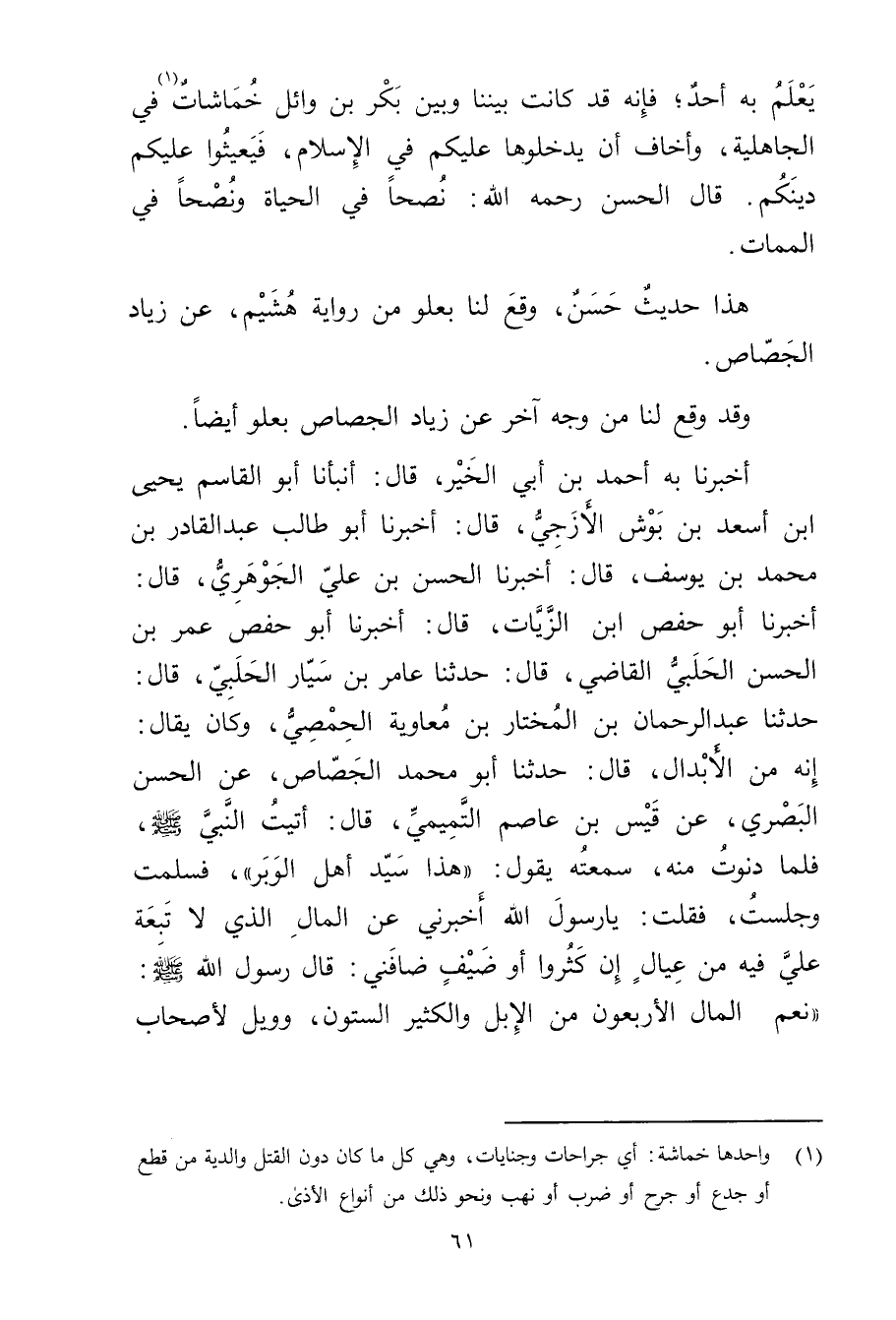أَخْبَرَنَا بِهِ أَحْمَد بْن أَبي الخير، قال: أَنْبَأَنَا أَبُو الْقَاسِمِ يحيى ابن أسعد بْن بوش الأزجي، قال: أخبرنا أَبُو طَالِبٍ عَبْدُ الْقَادِرِ بْنُ مُحَمَّدِ بْنِ يُوسُفَ، قال: أَخْبَرَنَا الْحَسَن بْن علي الجوهري، قال: أخبرنا أبو حفص ابن الزَّيَّاتِ، قال: أَخْبَرَنَا أَبُو حَفْصٍ عُمَربن الْحَسَن الحلبي الْقَاضِي، قال: حَدَّثَنَا عَامِر بْن سيار الحلبي، قال: حَدَّثَنَا عَبْد الرَّحْمَنِ بْن المختار بْن معاوية الحمصي، وكان يقال: إنه من الأبدال، قال: حَدَّثَنَا أَبُو مُحَمَّدٍ الْجَصَّاصُ، عَنِ الْحَسَنِ البَصْرِيّ، عَنْ قَيْسِ بْنِ عَاصِمٍ التَّمِيمِيِّ، قال: أَتَيْتُ النَّبِيَّ صلى الله عليه وسلم، فَلَمَّا دَنَوْتُ مِنْهُ، سَمِعْتُهُ يَقُولُ: "هَذَا سَيِّدُ أَهْلِ الْوَبَرِ "، فَسَلَّمْتُ وجَلَسْتُ، فَقُلْتُ: يَا رَسُولَ اللَّهِ أَخْبِرْنِي عَنِ الْمَالِ الَّذِي لا تَبِعَةَ عَلَيَّ فِيهِ مِنْ عِيَالٍ إِنْ كَثُرُوا أن ضَيْفٍ ضَافَنِي: قال رَسُولُ اللَّهِ صَلَّى اللَّهُ عَلَيْهِ وسَلَّمَ: "نِعْمَ الْمَالُ الأَرْبَعُونَ مِنَ الإِبِلِ والْكَثِيرُ الستون، وويل لاصحاب