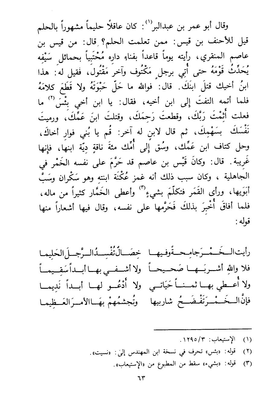 قال: فوالله مَا حل حبوته ولا قطع كلامه فلما أتمه التفت إِلَى ابْن أخيه، فَقَالَ: يَا ابْن أخي بئس (2) مَا فعلت أثمت ربك، وقطعت رحمك، وقتلت ابن عمك، ورميت نفسك بسهمك، ثُمَّ قال لابن له آخر: قم يَا بني فوار أخاك، وحل كتاف ابن عمك، وسق إلى أمك مئة ناقة دية ابنها فإنها غريبة. قال: وكان قَيْس بْن عَاصِم قد حرم على نفسه الخمر في الجاهلية، وكان سبب ذلك إنه غمز عكنة ابنته وهُوَ سكران وسب أبويها، ورأى القمر فتكلم بشيءٍ (3) وأعطى الخمار كثيرا من ماله، فلما أفاق أخبر بذلك فحرمها على نفسه، وَقَال فِيهَا أشعارا منها قوله: